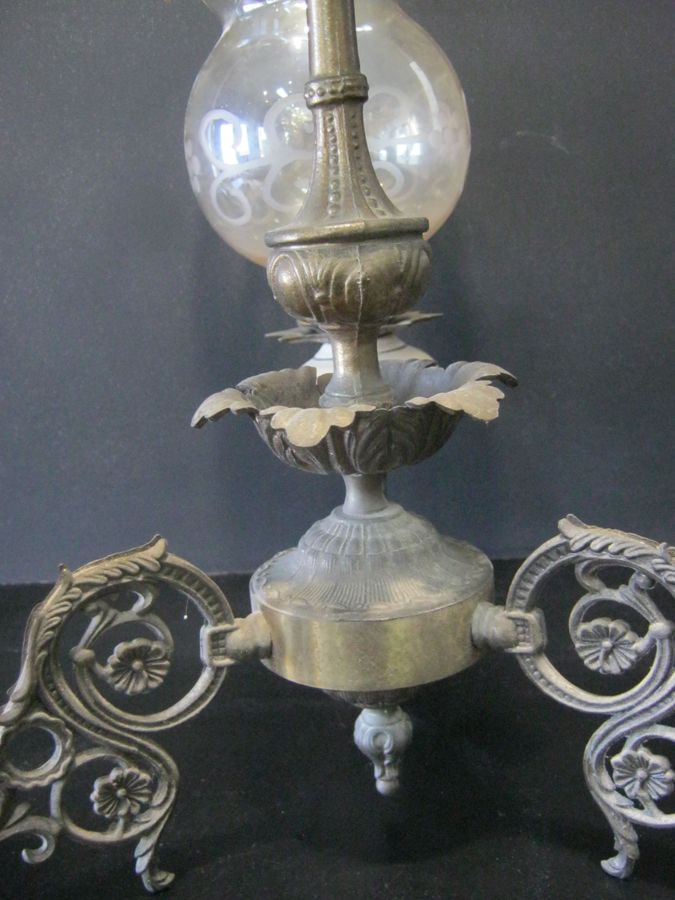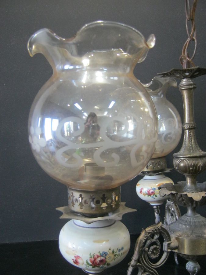 VINTAGE BRASS CHANDELIER WITH FLORAL CERAMIC BASE AND RUFFLED GLASS SHADES, 3 Arm, 60cm Long incl Chain