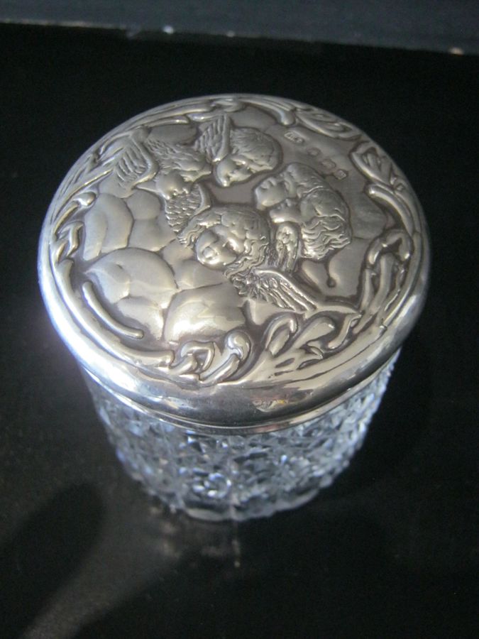 STERLING SILVER REYNOLDS ANGELS TOPPED CRYSTAL JAR, Birmingham 1905, 7cm Diameter, 16g