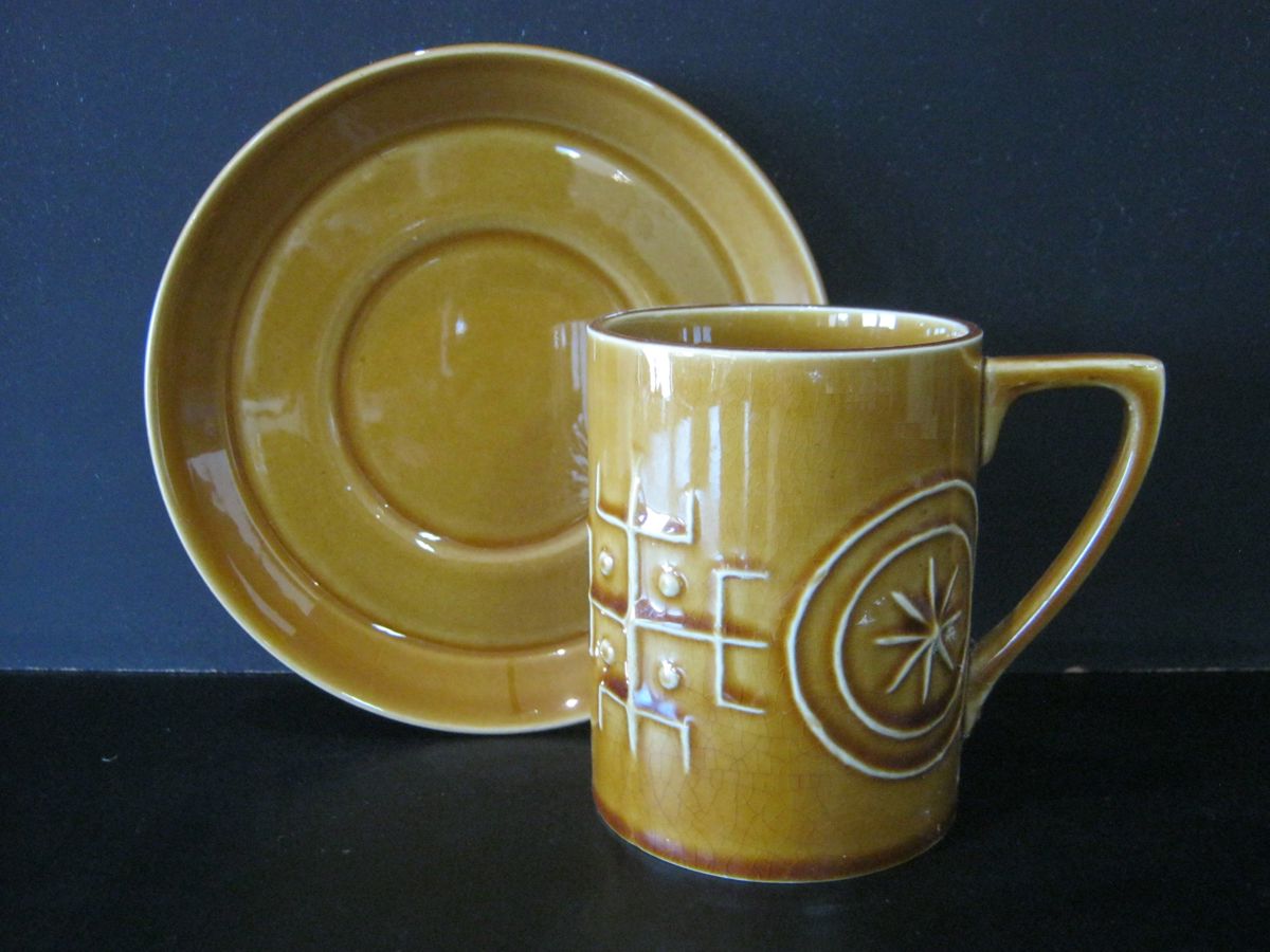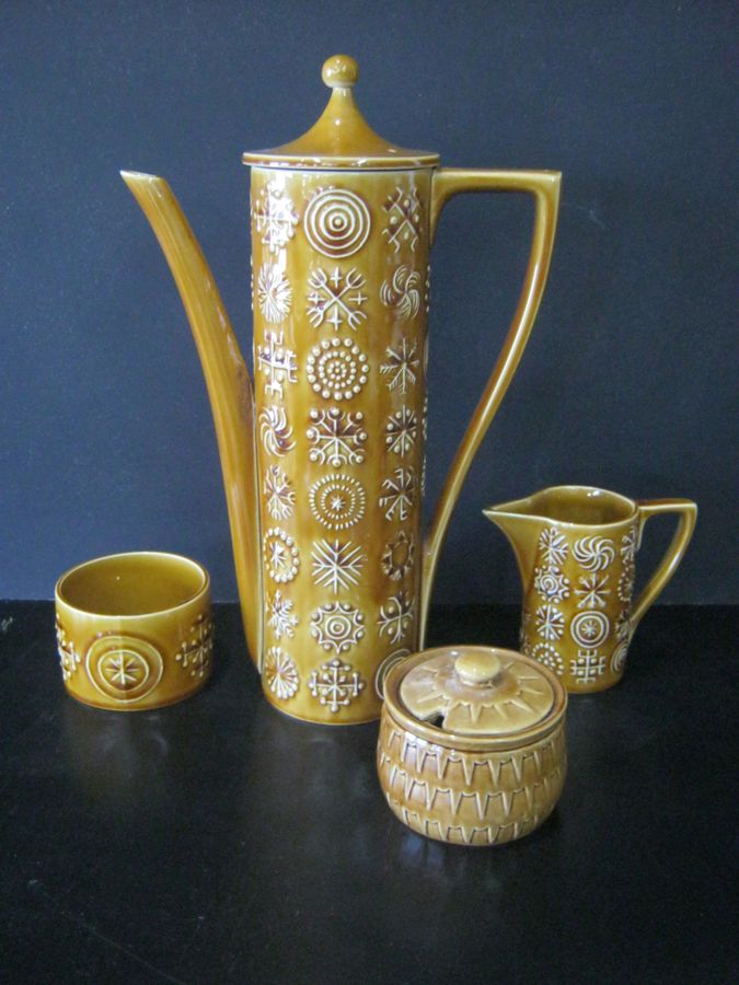 MID CENTURY PORTMEIRION 'TOTEM' COFFEE SET, Designed by Susan Williams-Ellis in 1961, Coffee Pot, Creamer, Covered Suagr Bowl, 6 x Cups and Saucers, Coffee Pot 32cm Tall