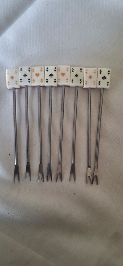 Vintage set of cocktail forks featuring card suit designs on handles.
