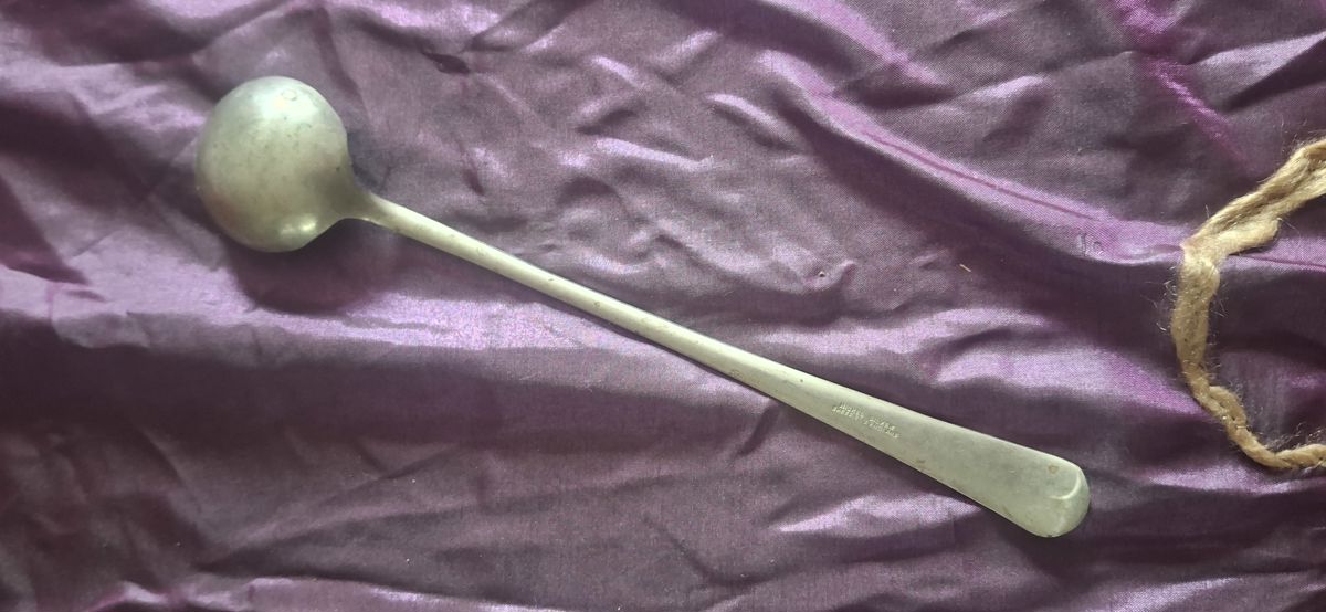 Antique nickel silver ladle with a long handle and marked "Nickel Silver Made in England."