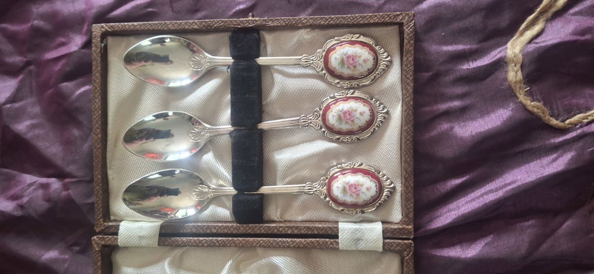 Set of 3 vintage silver-plated teaspoons with floral enamel design.