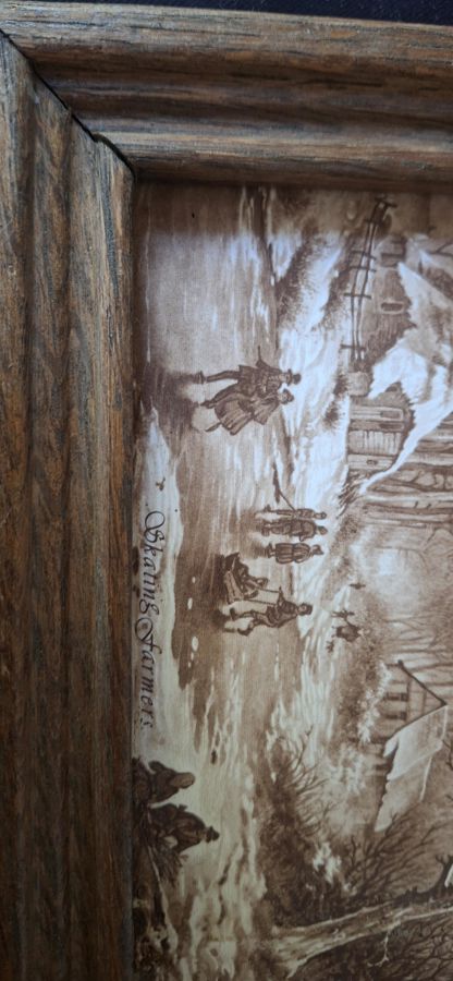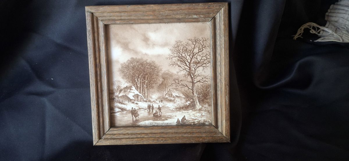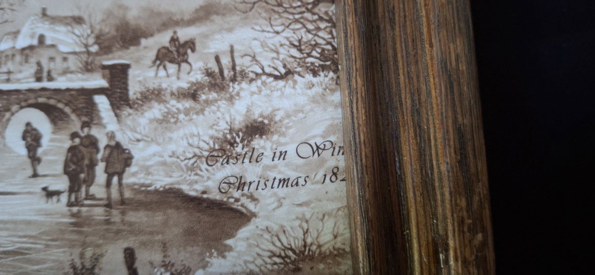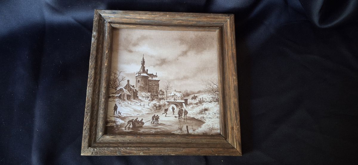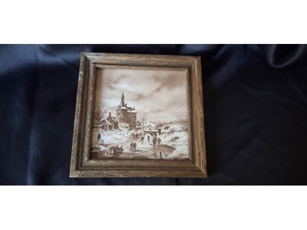 Pair of Royal Schwabap framed ceramic artworks featuring winter scenes.
