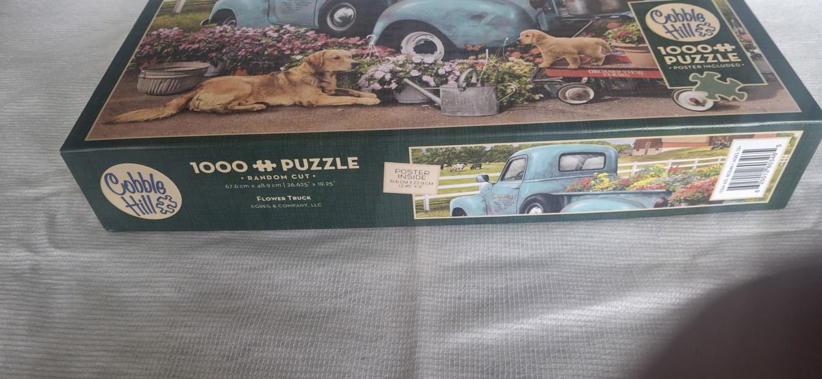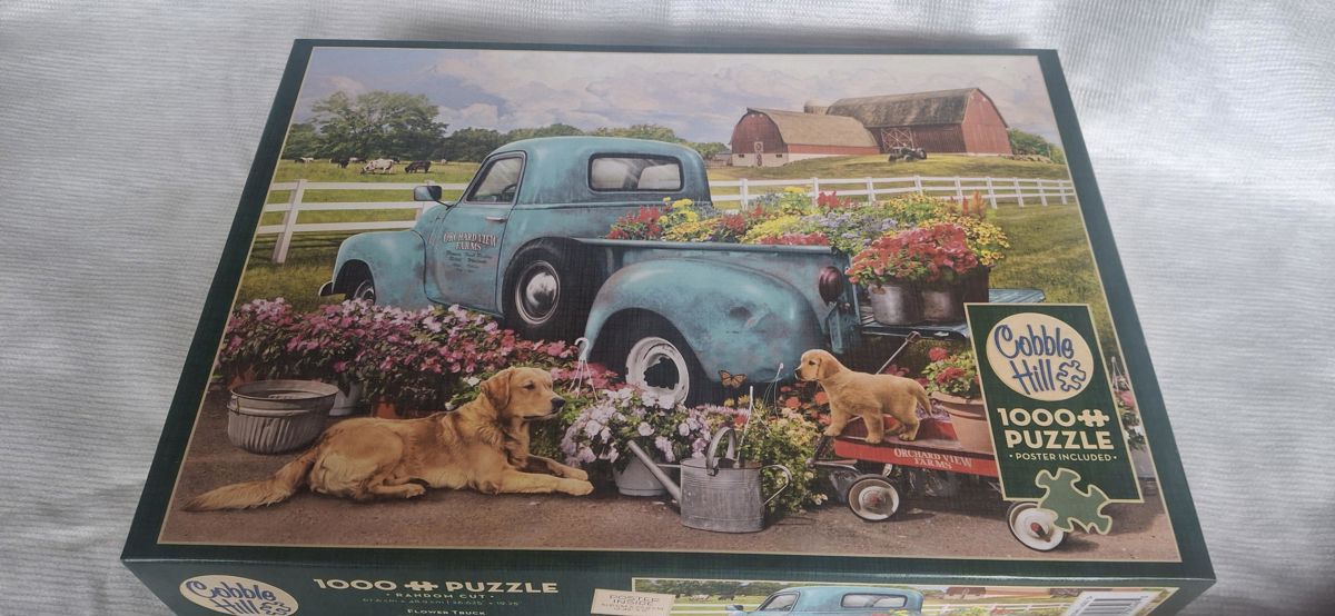 Cobble Hill 1000 Piece Puzzle featuring a rustic country truck scene with dogs and flowers.
