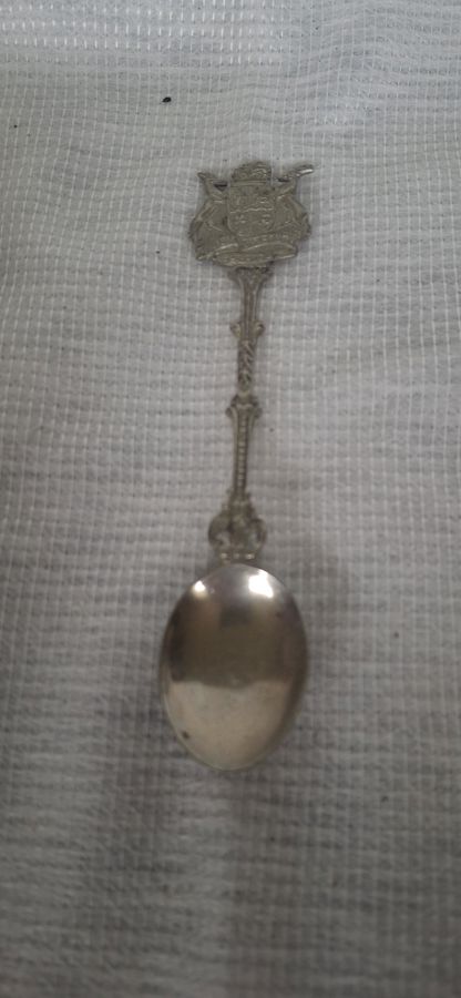 Silver souvenir spoon featuring a detailed coat of arms design.