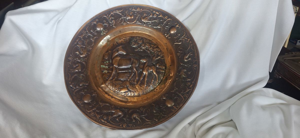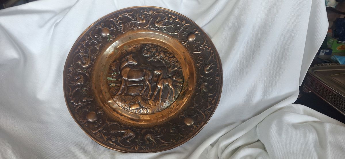 Antique copper decorative wall plate featuring detailed embossed artwork.