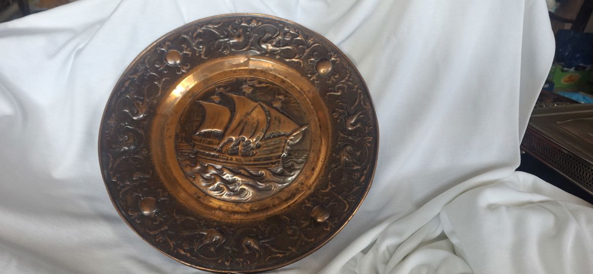 Vintage Copper Decorative Wall Plate featuring a detailed ship design.