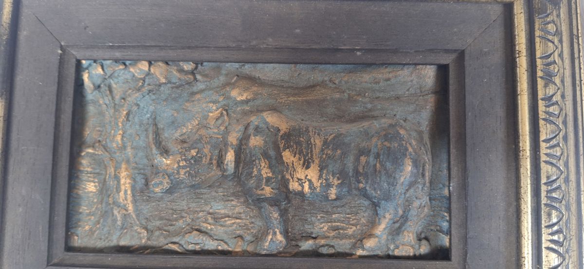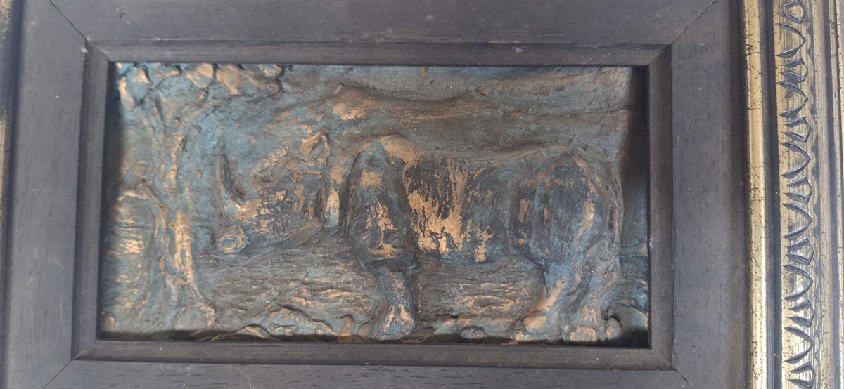 Framed bronze relief depicting a rhinoceros in a natural setting.