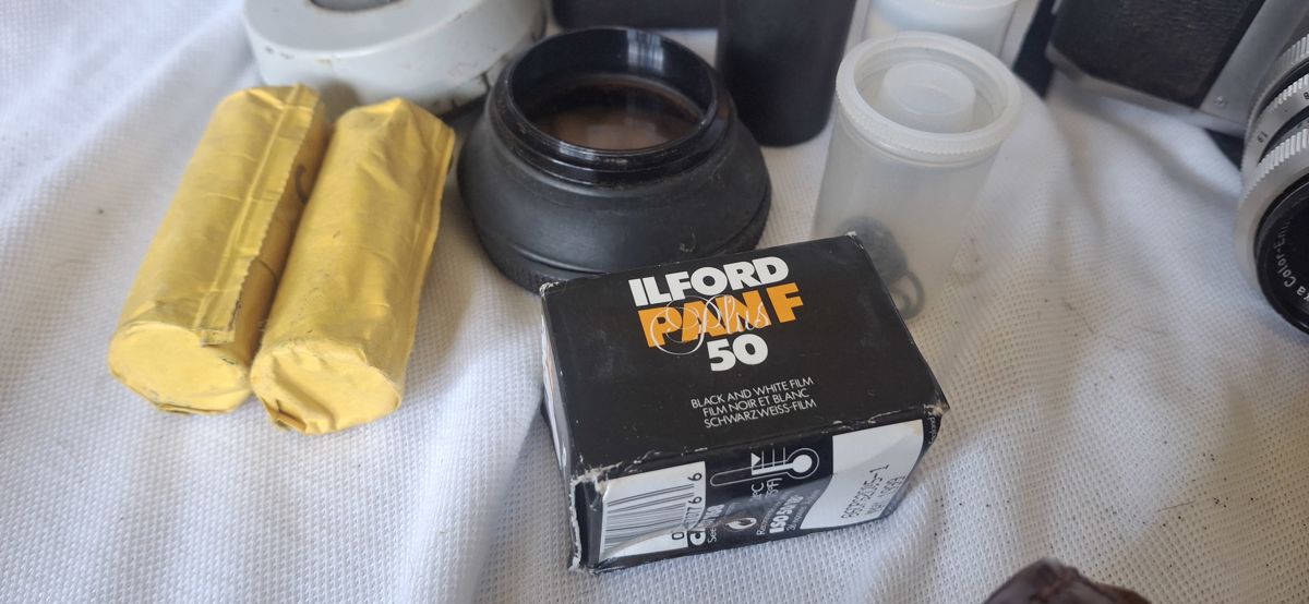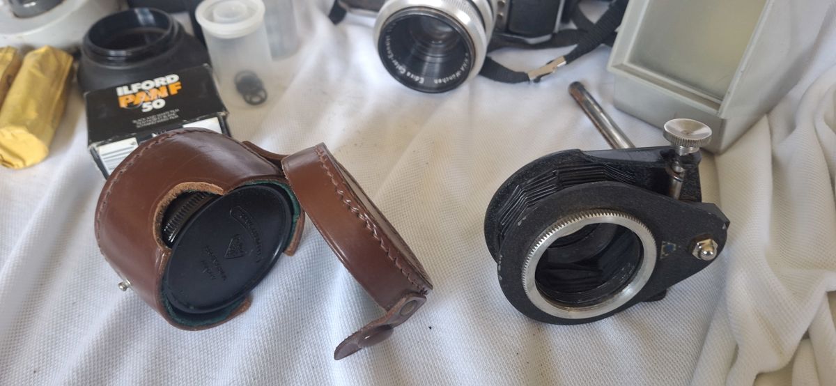 Accessories: Includes Continental Instaflash Model D, Paterson film viewer, camera leather cases, film canisters, film rolls, and various lens accessories