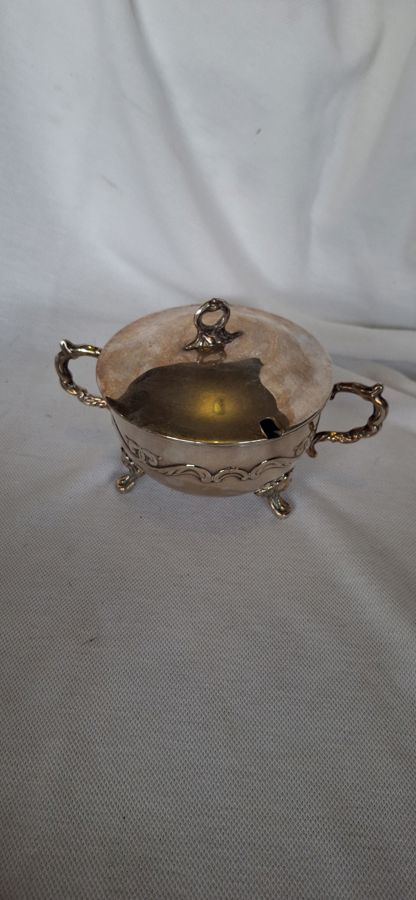 Silver-plated lidded sugar bowl with ornate handles and feet.