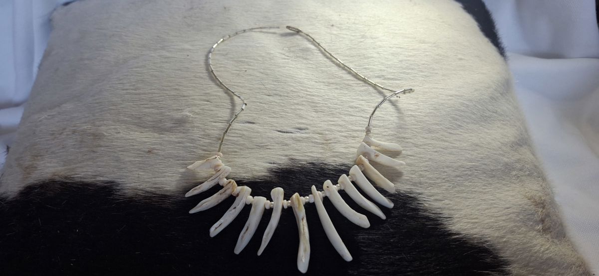 Handmade necklace featuring carved bone tooth-shaped pendants.