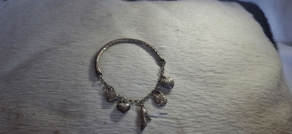 Silver charm bracelet featuring various charms including a heart, feather, and shell.
