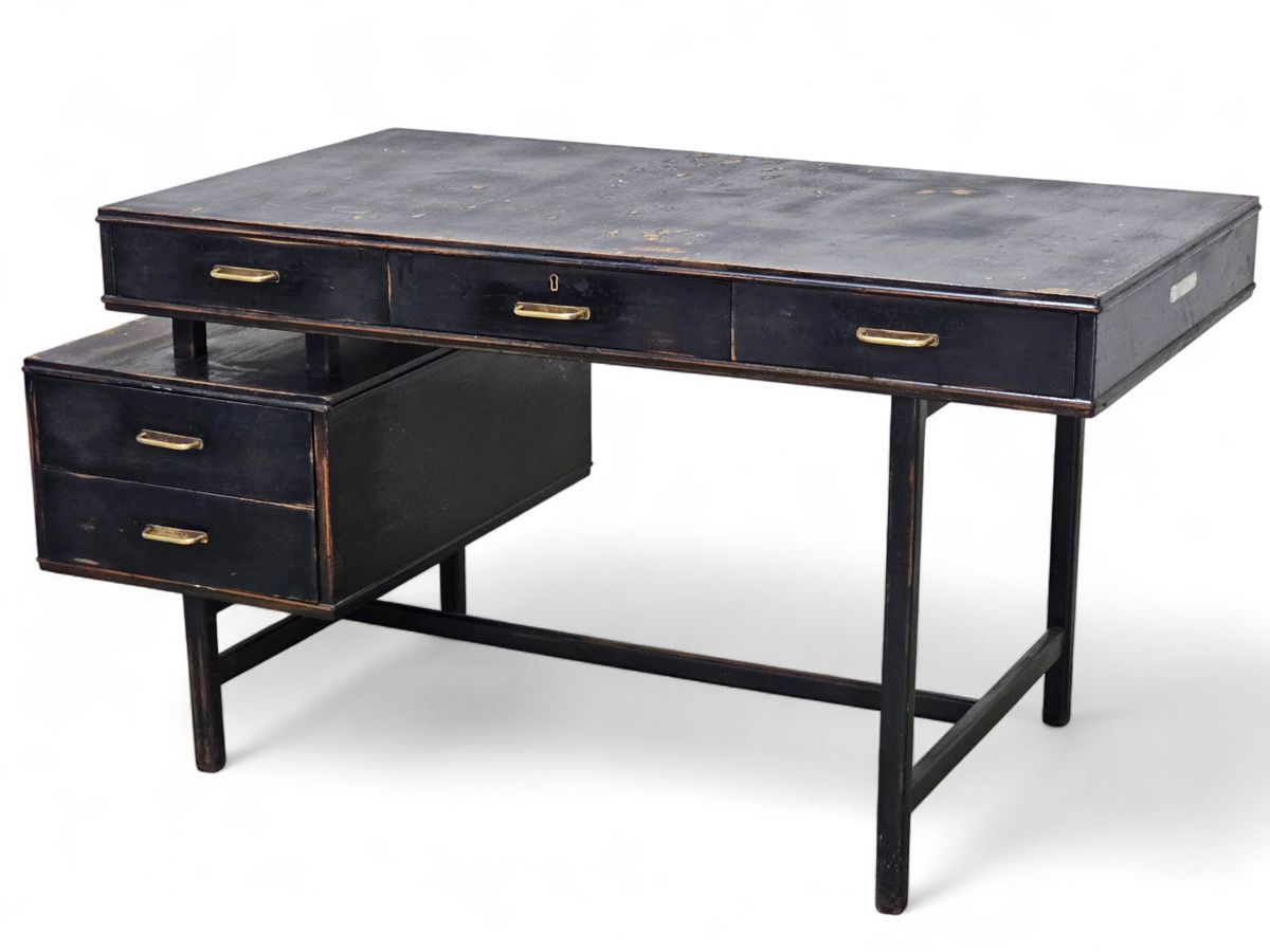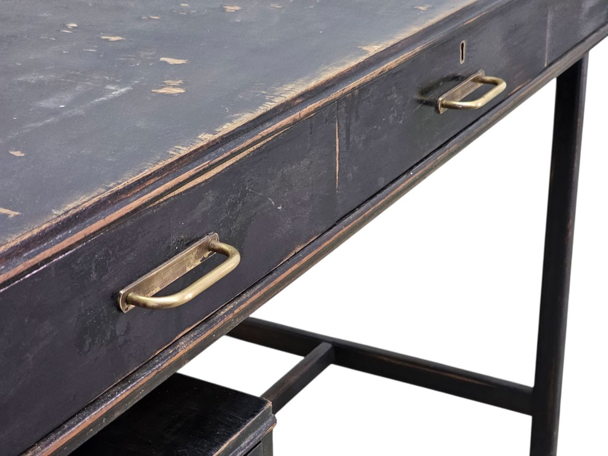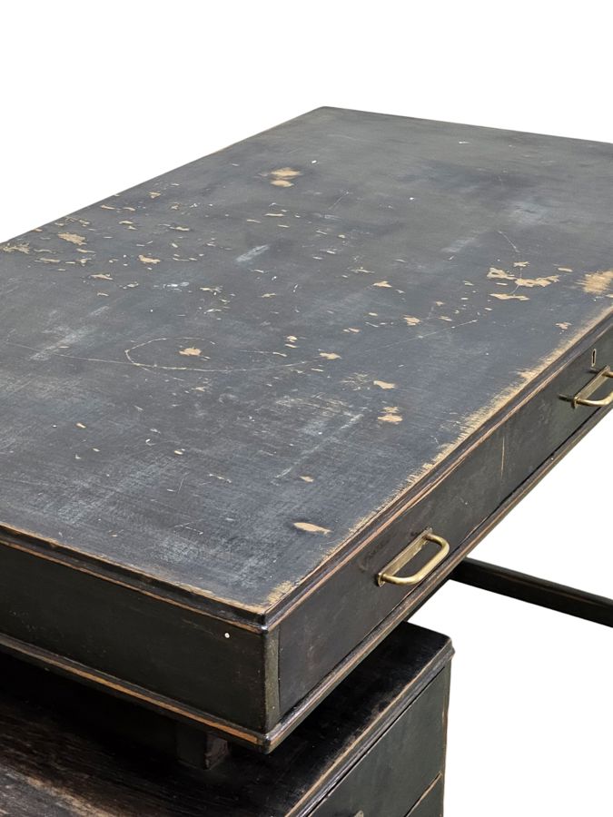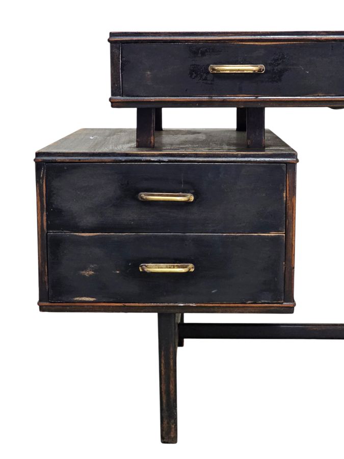 This desk is designed in a utilitarian mid-century style, featuring a rectangular top and an asymmetrical arrangement of drawers. It has three drawers horizontally aligned beneath the main desktop and a two-drawer pedestal on the left side, connected by a simple stretcher base. The desk is finished in a distressed or worn black lacquer/paint, revealing hints of the underlying material at the edges, which adds a vintage, industrial character. It is fitted with brass-tone pull handles. The desk was painted and sanded to give it a destressed feel and look . Scratches form part of age related ware