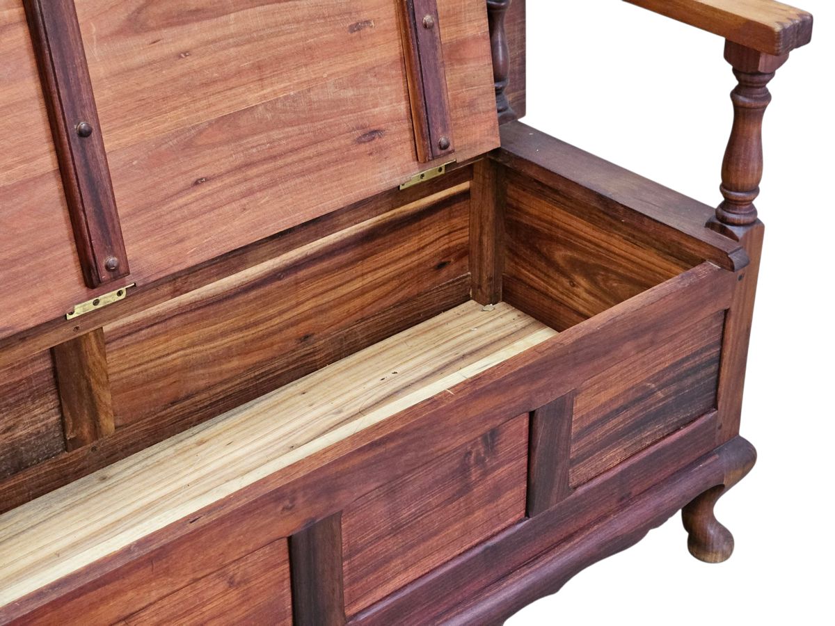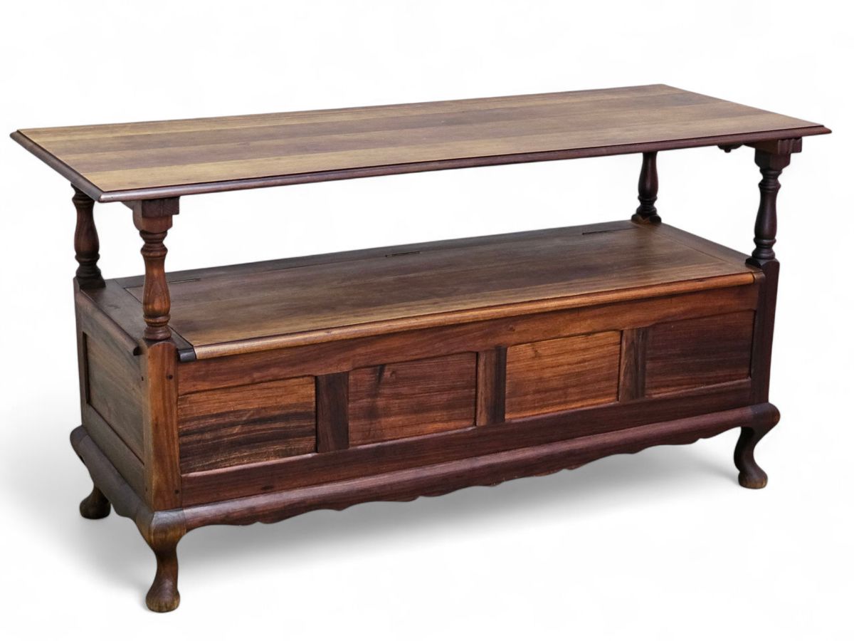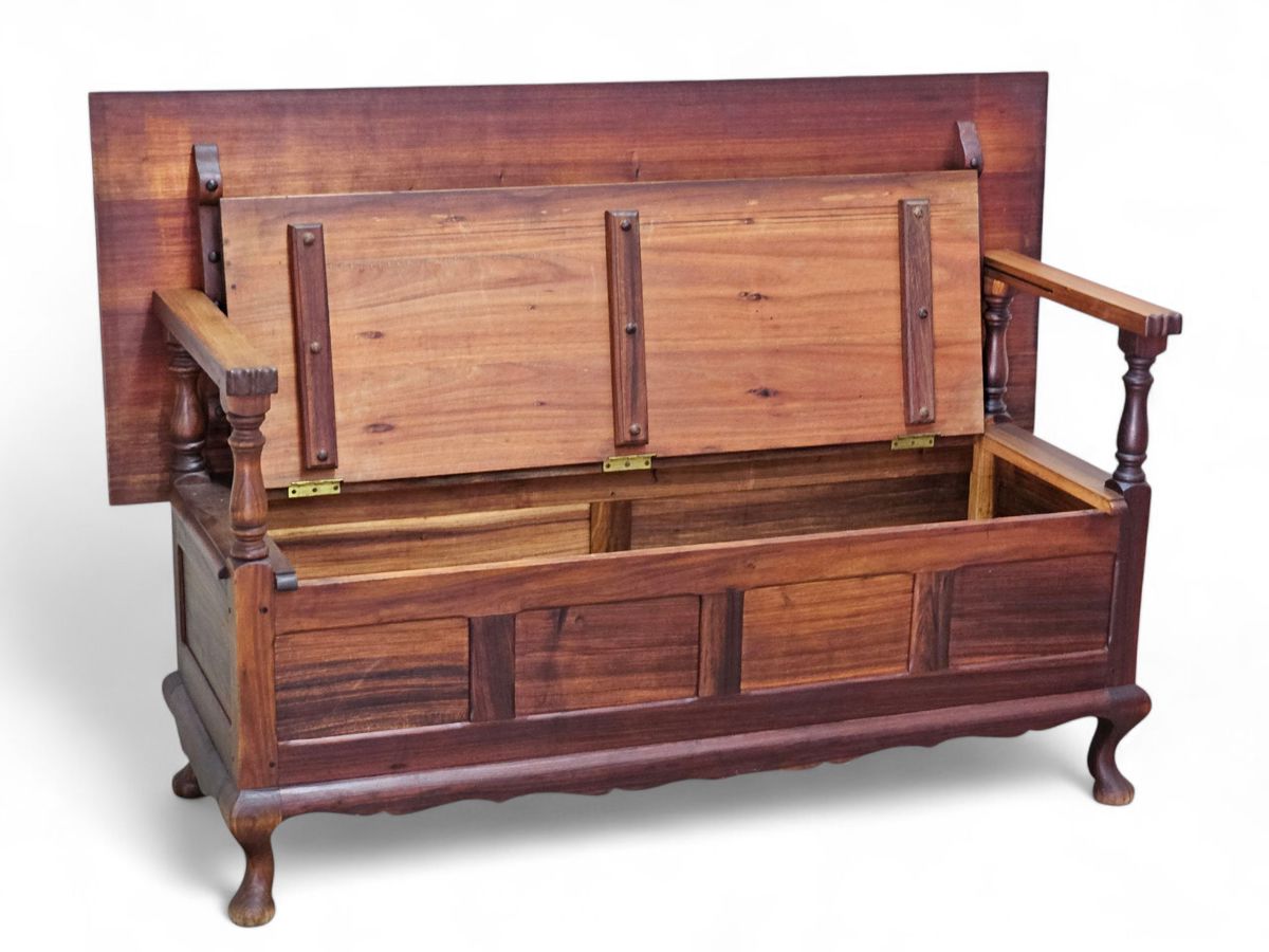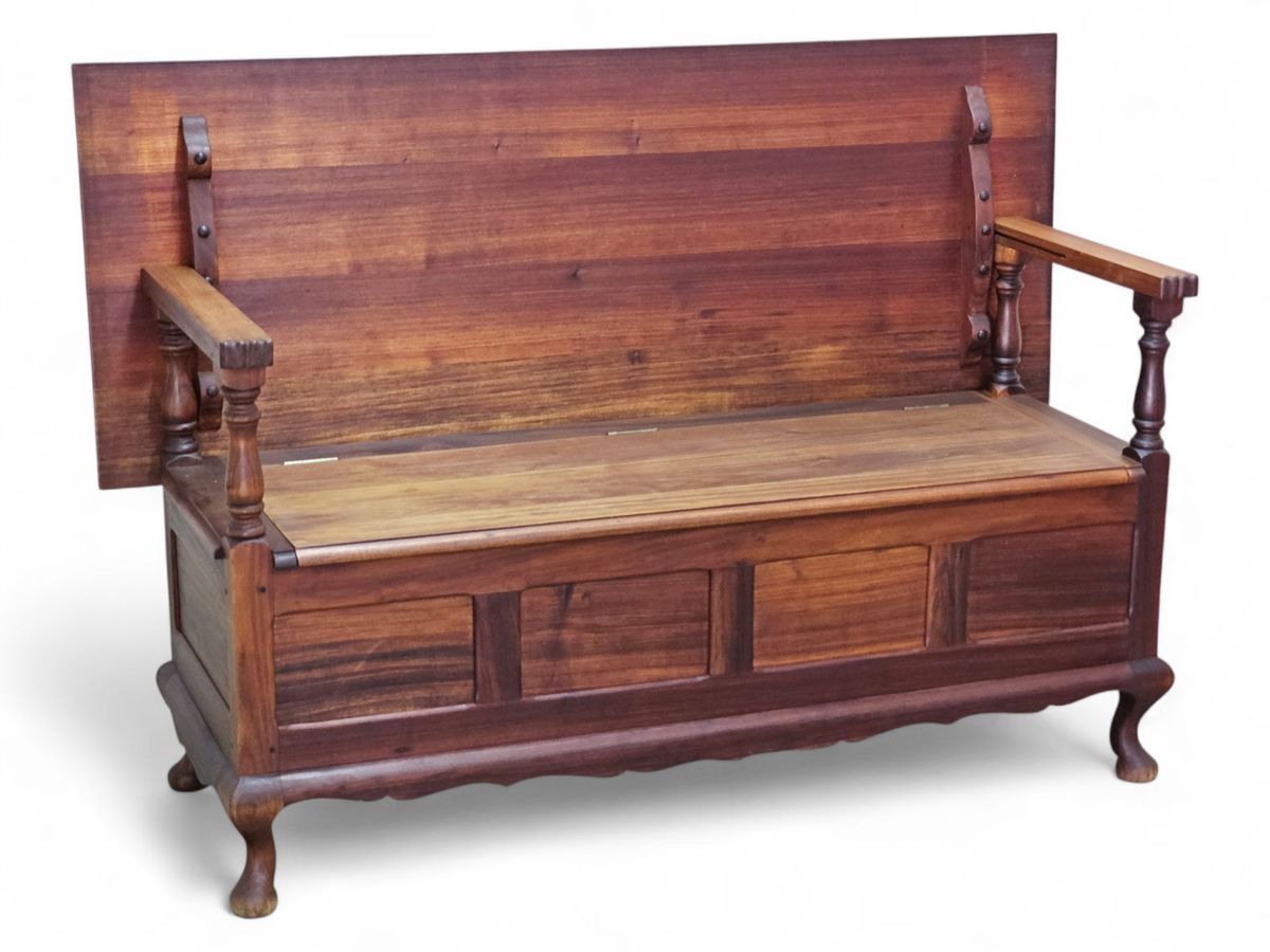This is a versatile piece of furniture crafted from a rich-toned hardwood, potentially a form of oak or a local South African wood like imbuia or stinkwood, in a traditional style. The design features a high, panelled backrest (three vertical panels are visible) and open arms with turned supports. The backrest is hinged and can be tilted and slid forward to rest on the arm supports, transforming the bench into a functional table. The seat is also hinged, revealing a spacious storage compartment within the base. The piece rests on a shaped plinth base with bracket or bun feet.