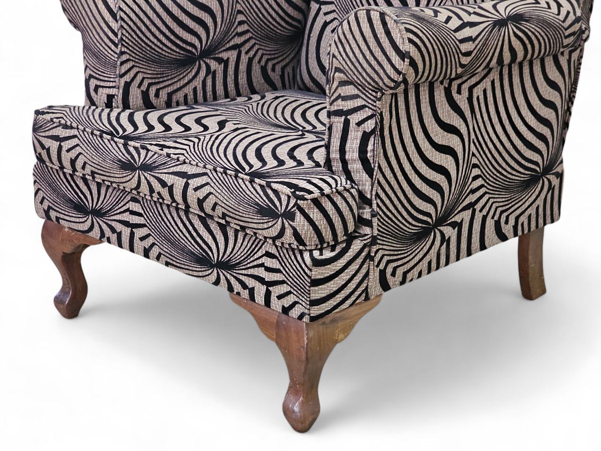 An elegant and commanding wingback armchair (sometimes referred to as an 'earpatch' armchair) featuring a tall backrest with pronounced side wings designed to envelop the sitter. The chair is fully upholstered in a bold, eye-catching textile with an abstract, swirling black-and-beige pattern reminiscent of animal print or op-art design. The upholstery appears to be in good condition.