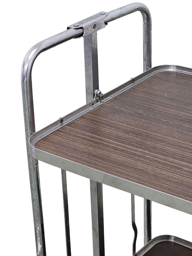 Likely German-made (e.g., Bremshey, Gerlinol), dating from the 1950s to 1970s. The trolley features a thin, tubular chrome or metal frame and two rectangular, wood-effect laminate (Formica) shelves. It is designed to fold nearly flat for easy storage and has functional rolling caster wheels.
