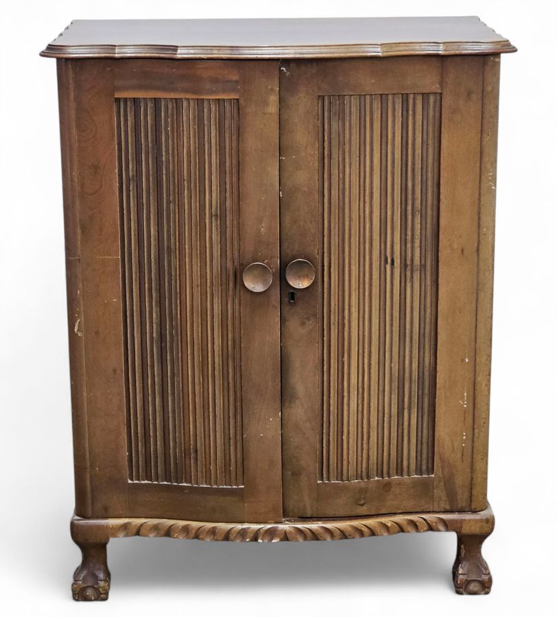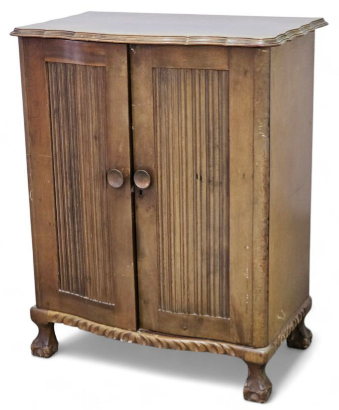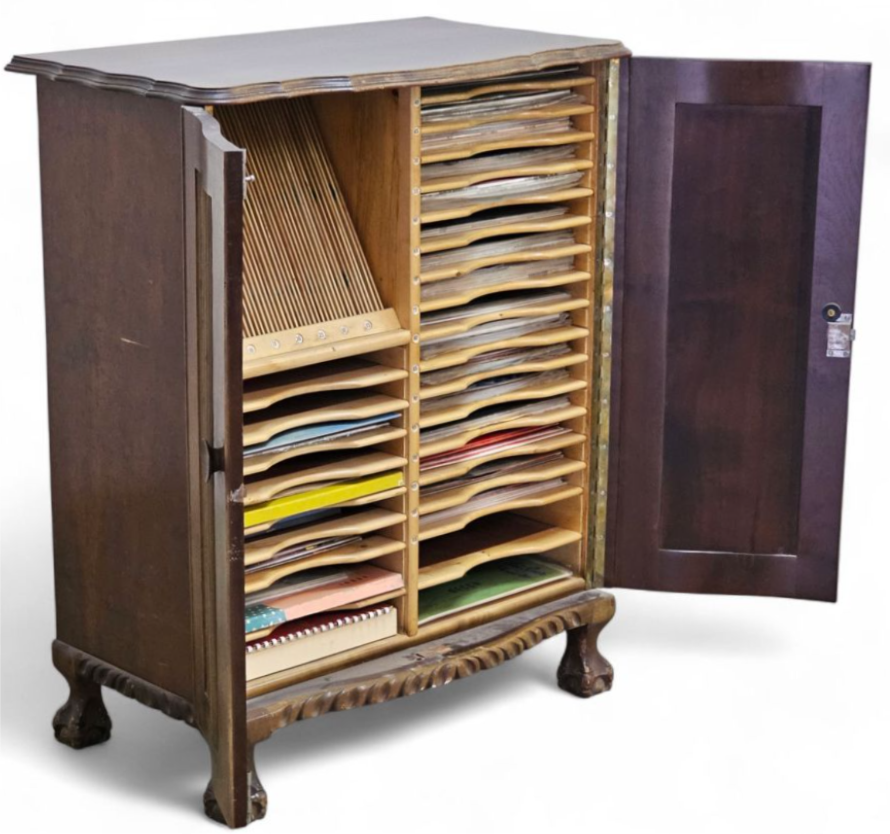 Made in a traditional style with two hinged doors that open to reveal a highly compartmentalized interior. The right side features numerous shallow, open-front shelves designed to accommodate flat items such as sheet music, records (vinyl), or historical paperwork/plans. The left side has vertical dividers for upright storage of similar items. The cabinet features a decorative molded top edge and stands on an ornate, carved wooden base with ball-and-claw feet, indicative of a Jacobean or Georgian Revival influence. Considering the age in very good condition , scratches may be part of the cabinet