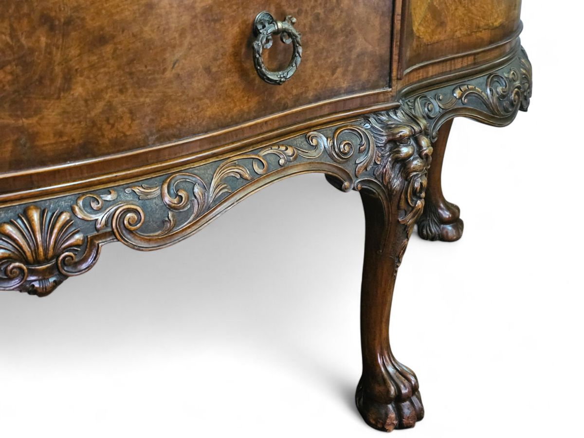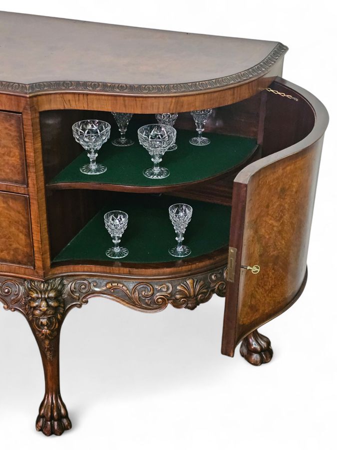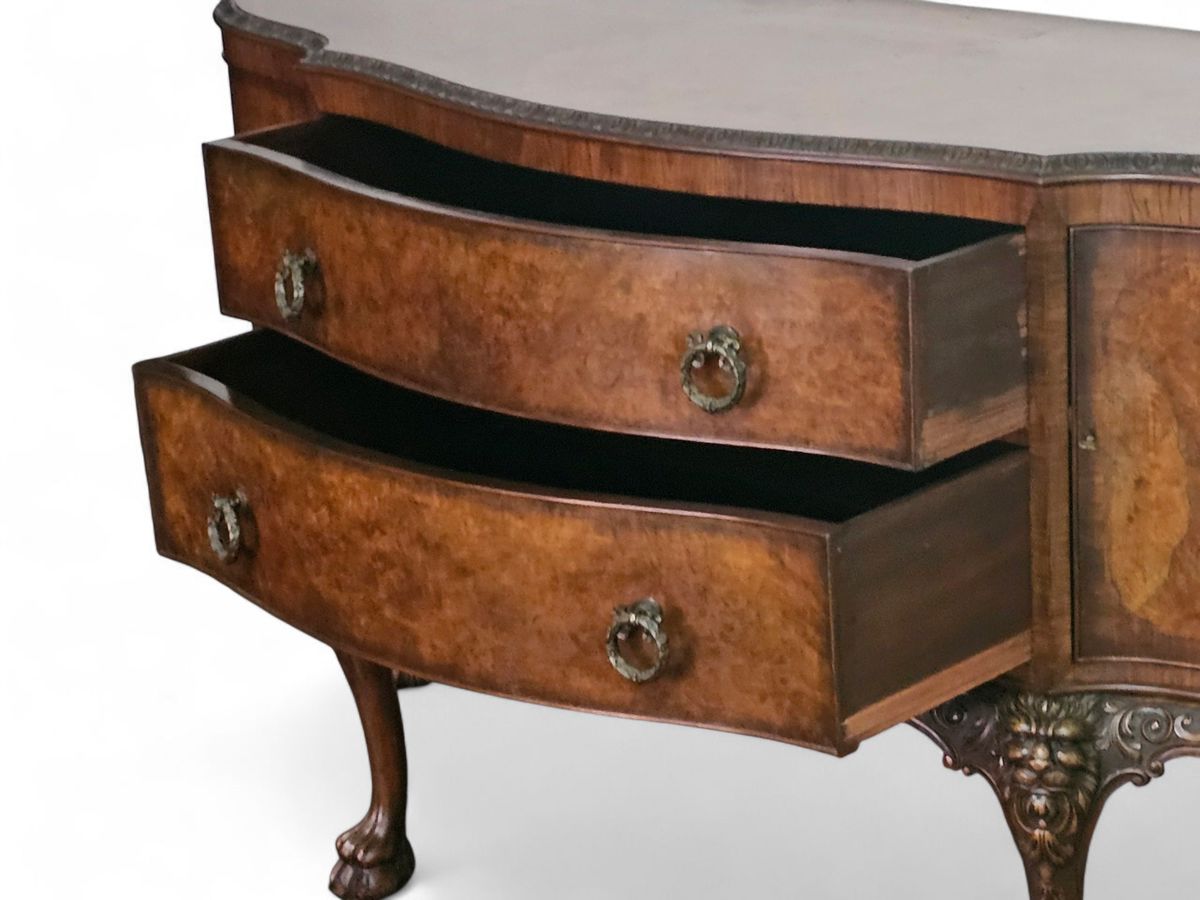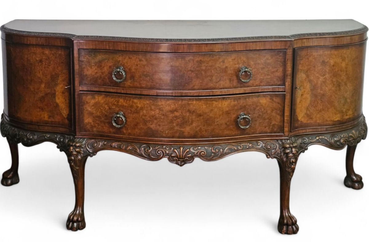 Circa 1900-1920, in the Queen Anne or Chippendale Revival style. It features a distinctive serpentine or "bow front" shape with two central drawers flanked by curved side cupboards. The drawers and doors showcase beautiful, highly figured burr walnut panels and are fitted with original, ornate brass-tone drop-ring pull handles. The sideboard is supported by ornately carved cabriole legs terminating in prominent ball-and-claw feet.