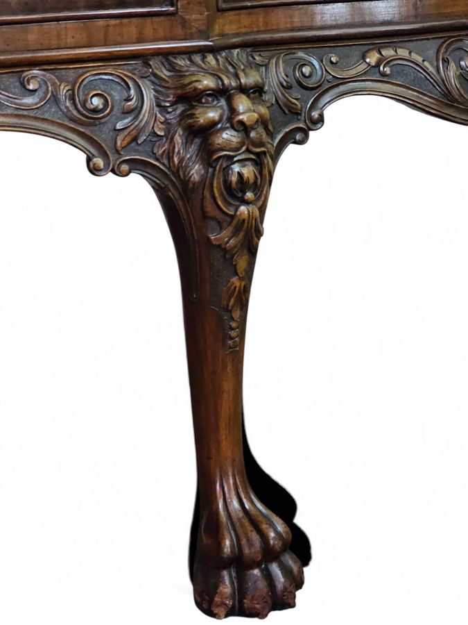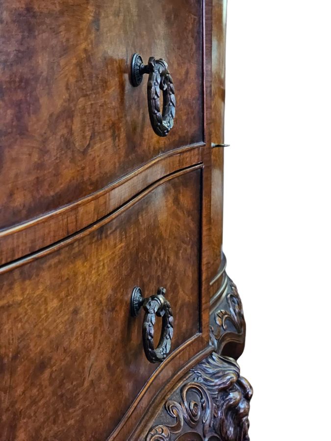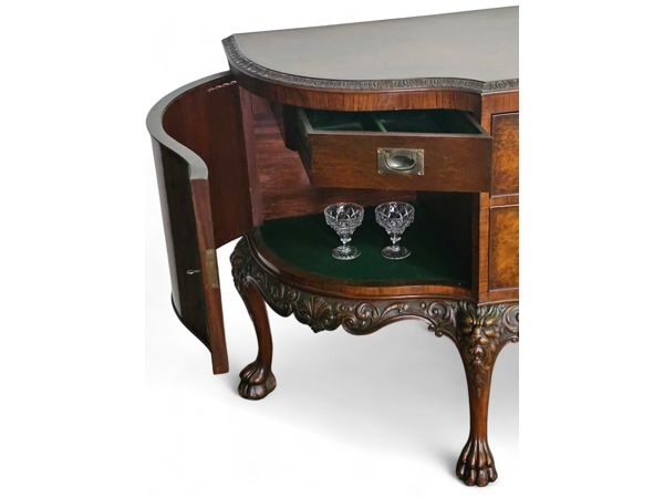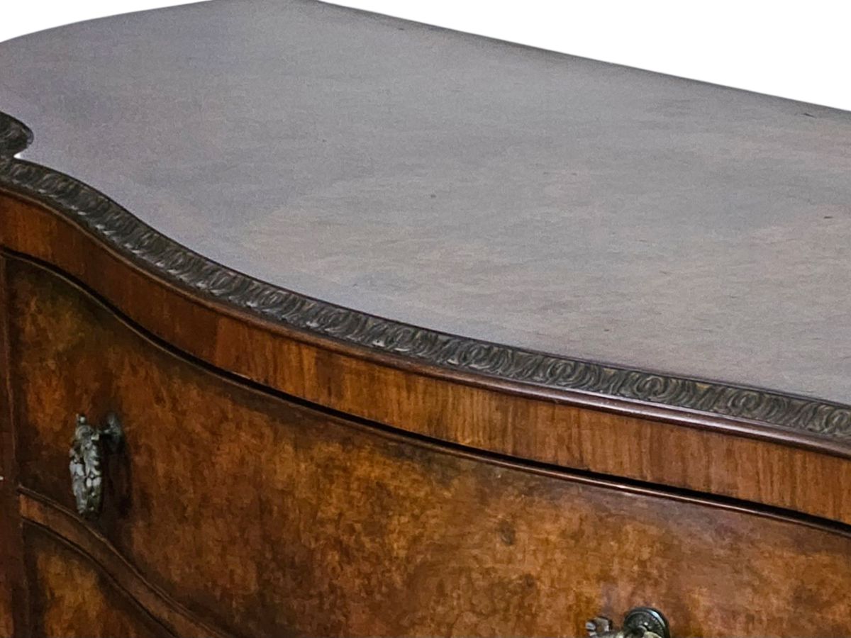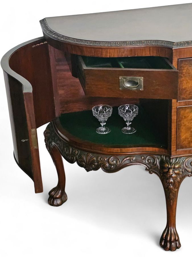 Circa 1900-1920, in the Queen Anne or Chippendale Revival style. It features a distinctive serpentine or "bow front" shape with two central drawers flanked by curved side cupboards. The drawers and doors showcase beautiful, highly figured burr walnut panels and are fitted with original, ornate brass-tone drop-ring pull handles. The sideboard is supported by ornately carved cabriole legs terminating in prominent ball-and-claw feet.