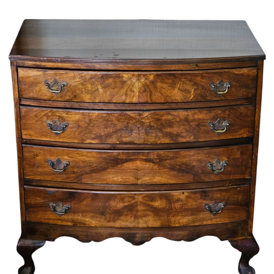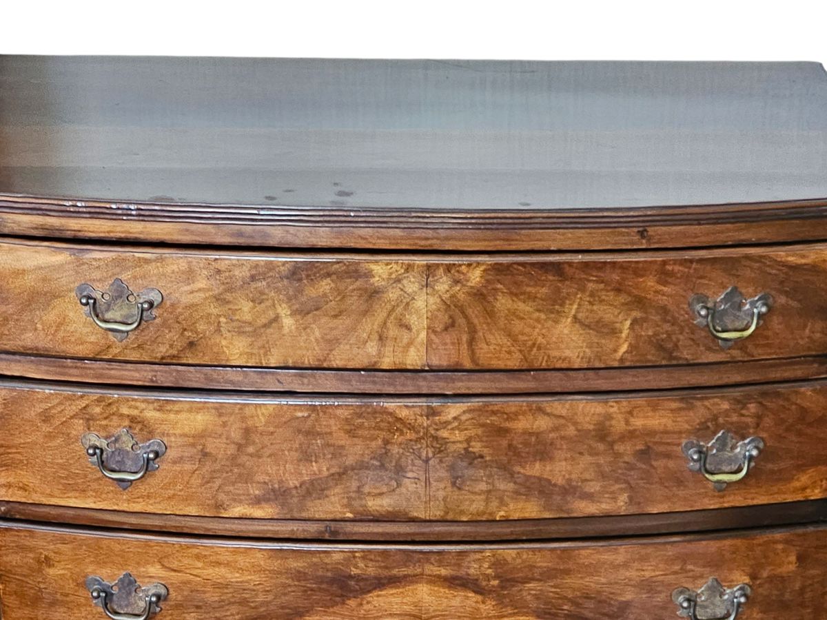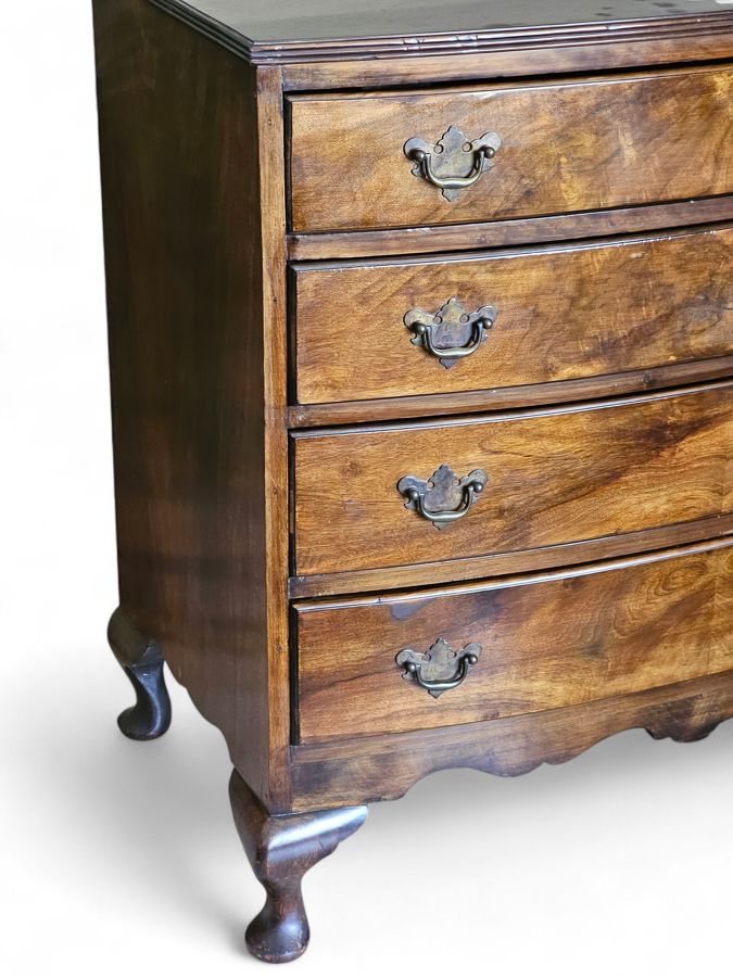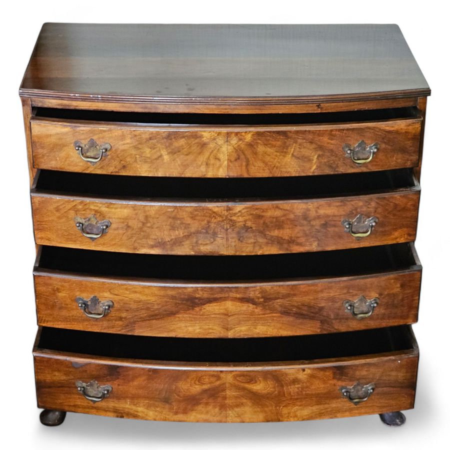 Early 19th Century mahogany bow-front chest of drawers 83cm(w) x 46cm(d) x 85cm(h) . The piece features four graduating long drawers (two short drawers over two or three long drawers are also common configurations for this style), all exhibiting beautiful flame or figured mahogany veneer panels. The drawers are fitted with period-style brass-tone drop-pull handles. The chest has a classic molded top edge and stands on four substantial elegant splayed or "French" feet with a shaped apron between them. Age related ware overall in great condition considering its age