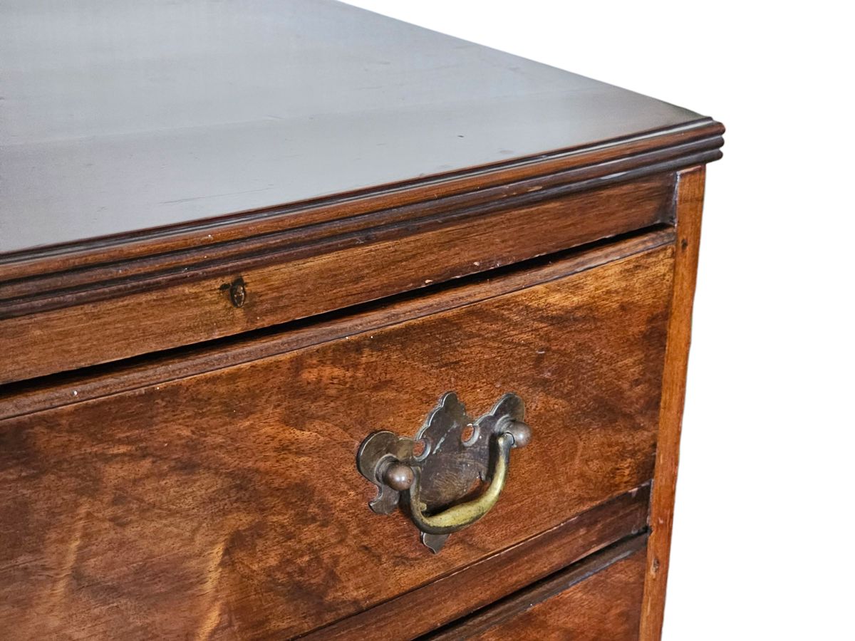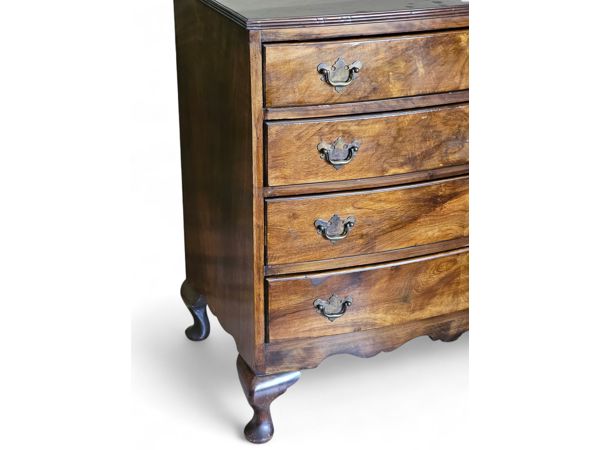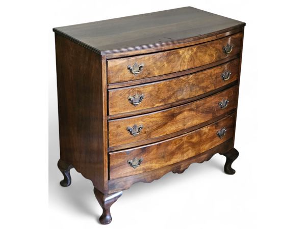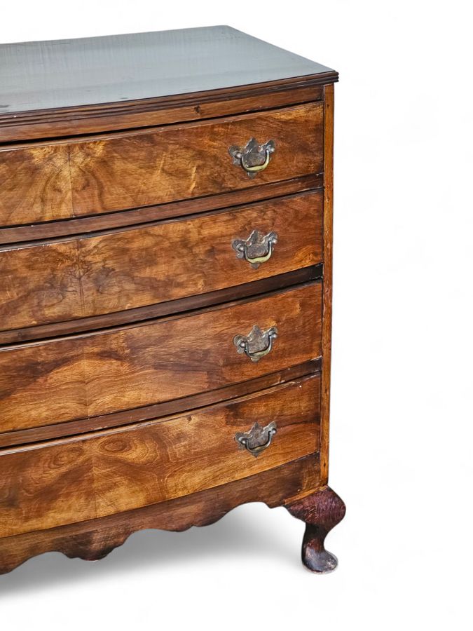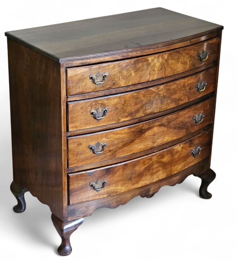 Early 19th Century mahogany bow-front chest of drawers 83cm(w) x 46cm(d) x 85cm(h) . The piece features four graduating long drawers (two short drawers over two or three long drawers are also common configurations for this style), all exhibiting beautiful flame or figured mahogany veneer panels. The drawers are fitted with period-style brass-tone drop-pull handles. The chest has a classic molded top edge and stands on four substantial elegant splayed or "French" feet with a shaped apron between them. Age related ware overall in great condition considering its age
