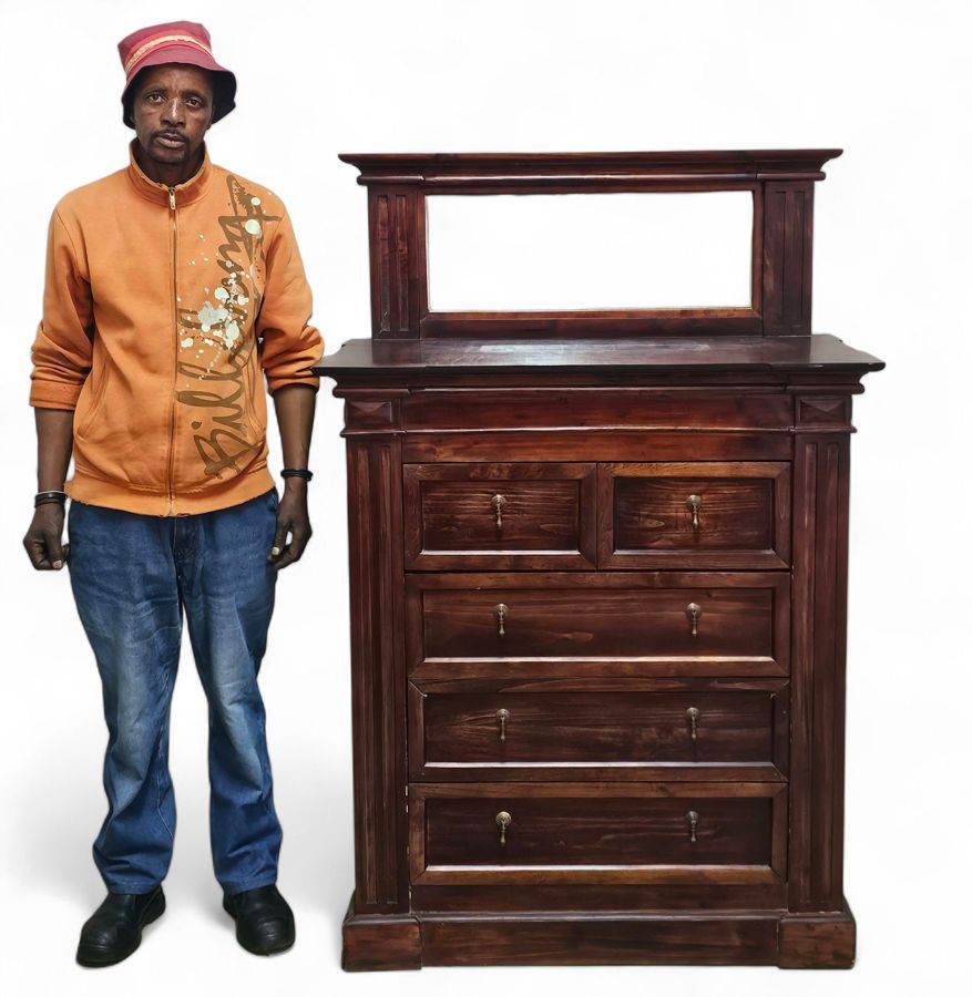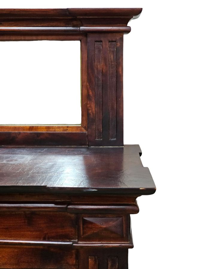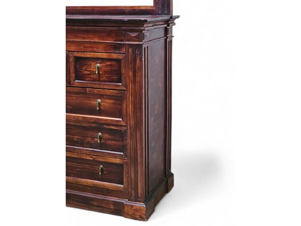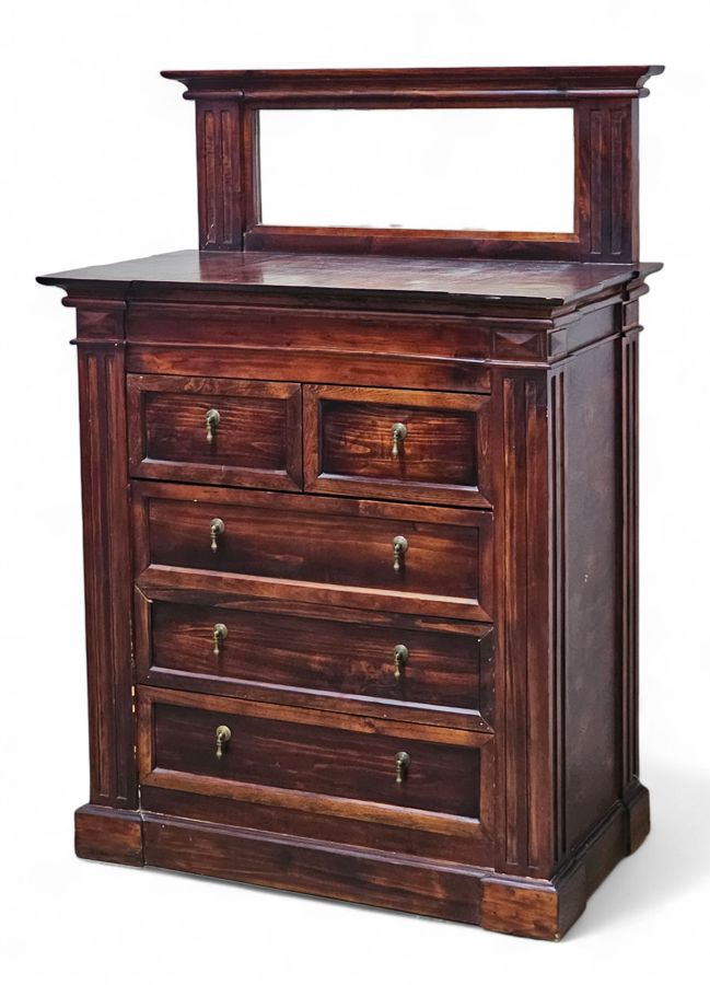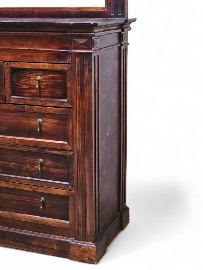 An attractive and robust antique style chest of drawers (dresser), typically referred to as a bureau or dressing chest when accompanied by a mirror. This piece, crafted from solid wood, features the deep, rich color and high-quality