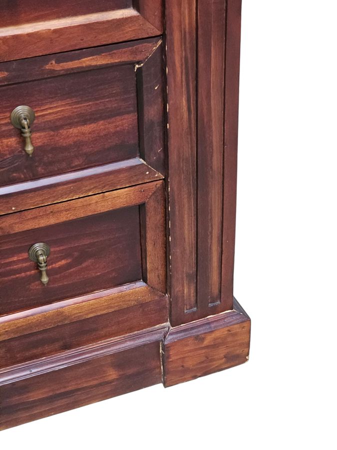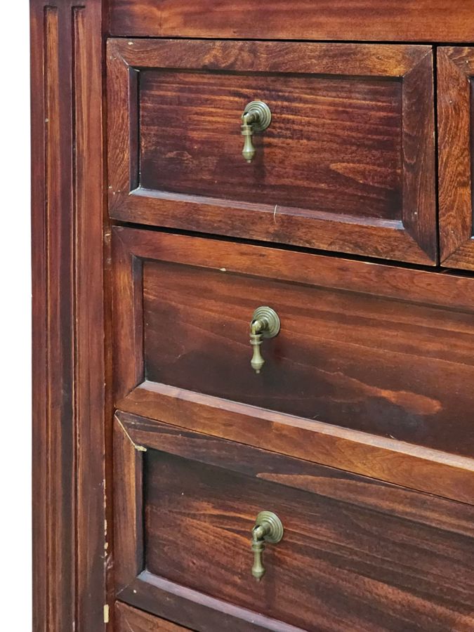 The chest is designed in an American Empire style, noted for its heavy proportions, thick columns, and masculine profile. It offers substantial storage space and timeless elegance. Scuffing marks , needs a bit of touchups and will be as good as new. Brass Teardrop handles on all drawers