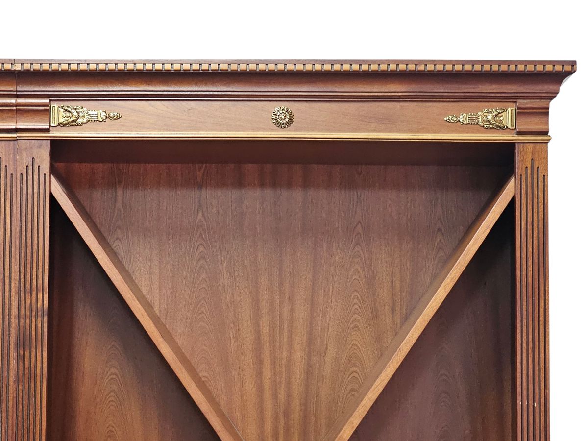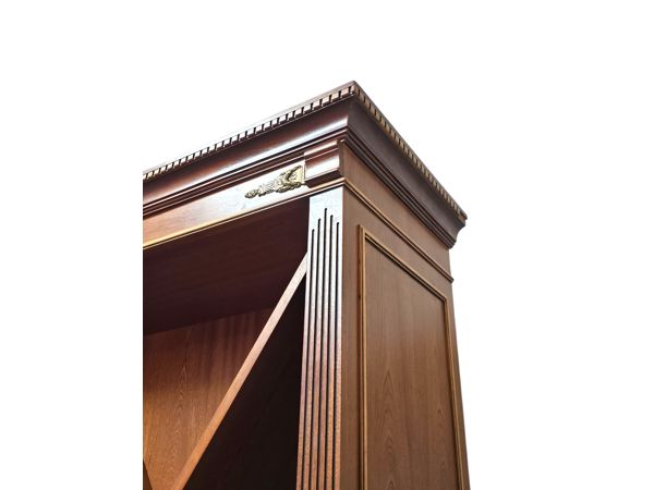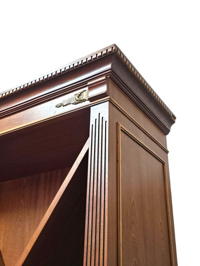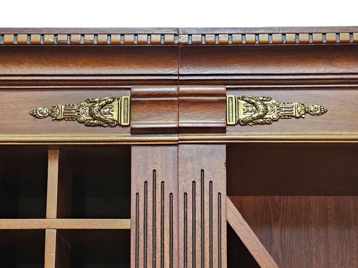 The cabinet presents a rich, deep finish and is built to last. The design is both elegant and highly functional, featuring two distinct storage sections with decorative fluted pilasters and classic brass-tone hardware.