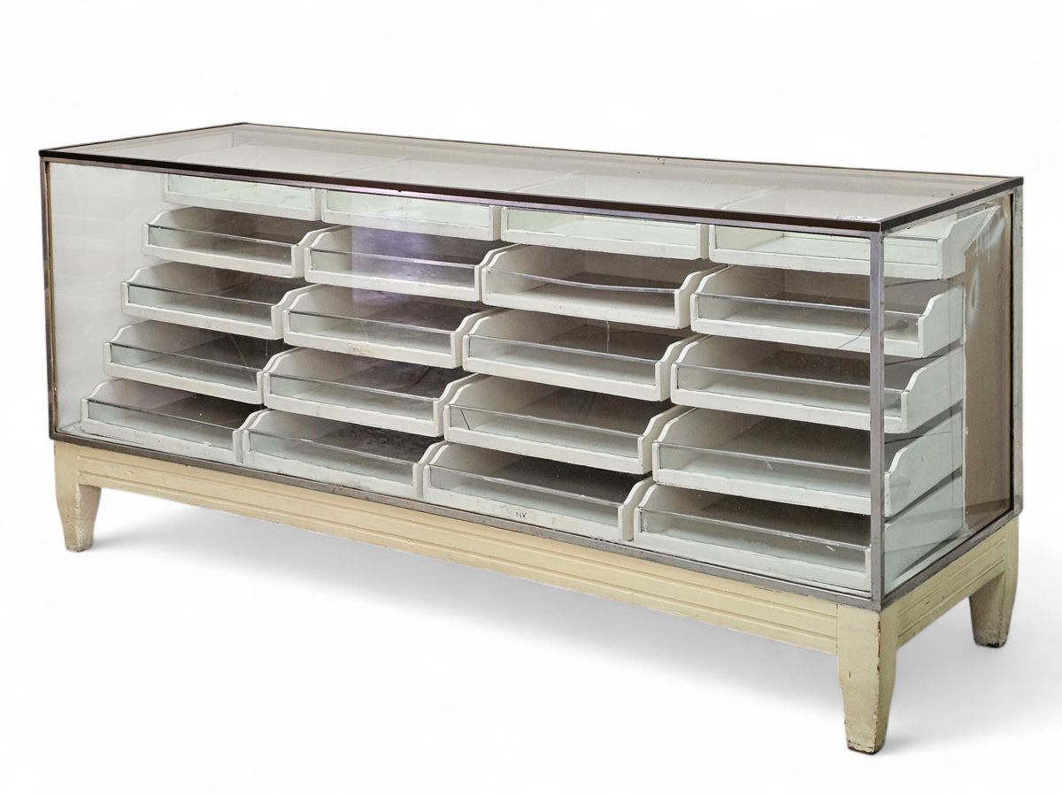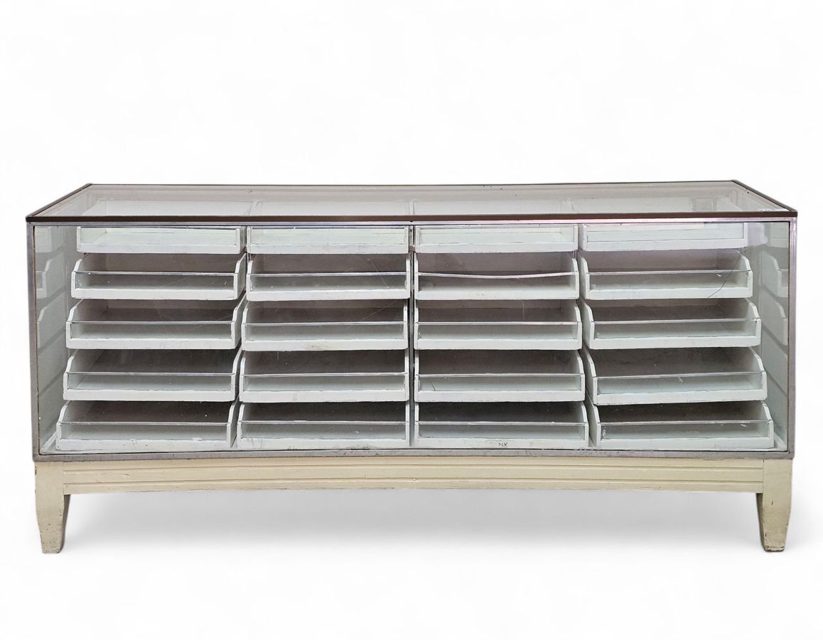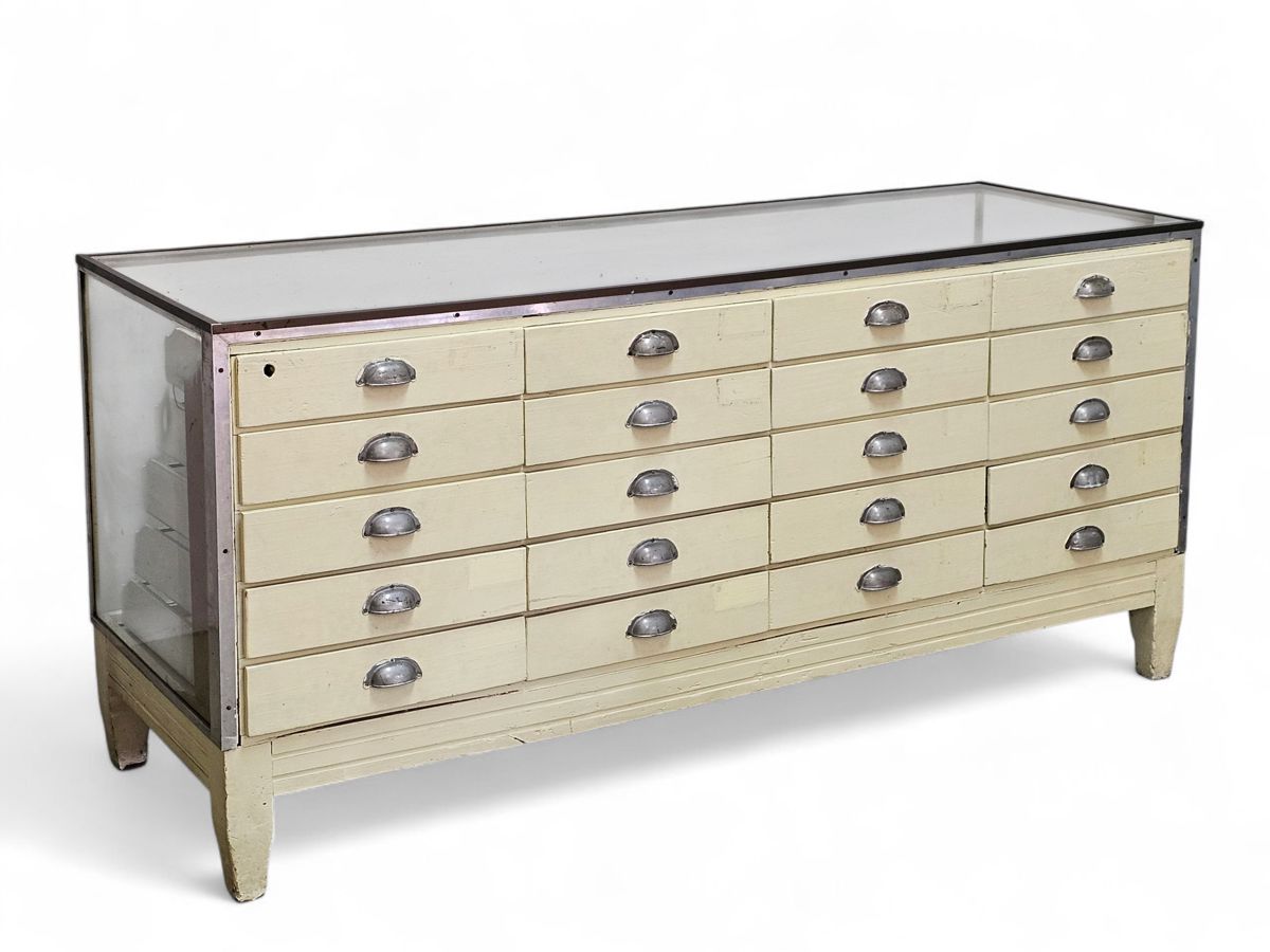 Construction: The main framework around the glass sections is made of aluminium. The base unit and drawer fronts are made of solid wood.Design: A long, low counter featuring a large bank of 20 drawers, each fitted with original or period-appropriate metal cup handles. The glass top, front, and side panels allow for items to be displayed prominently.Condition of Glass: The glass components are in excellent order, with no cracks or chips anywhere on the frame or panels.Painted.