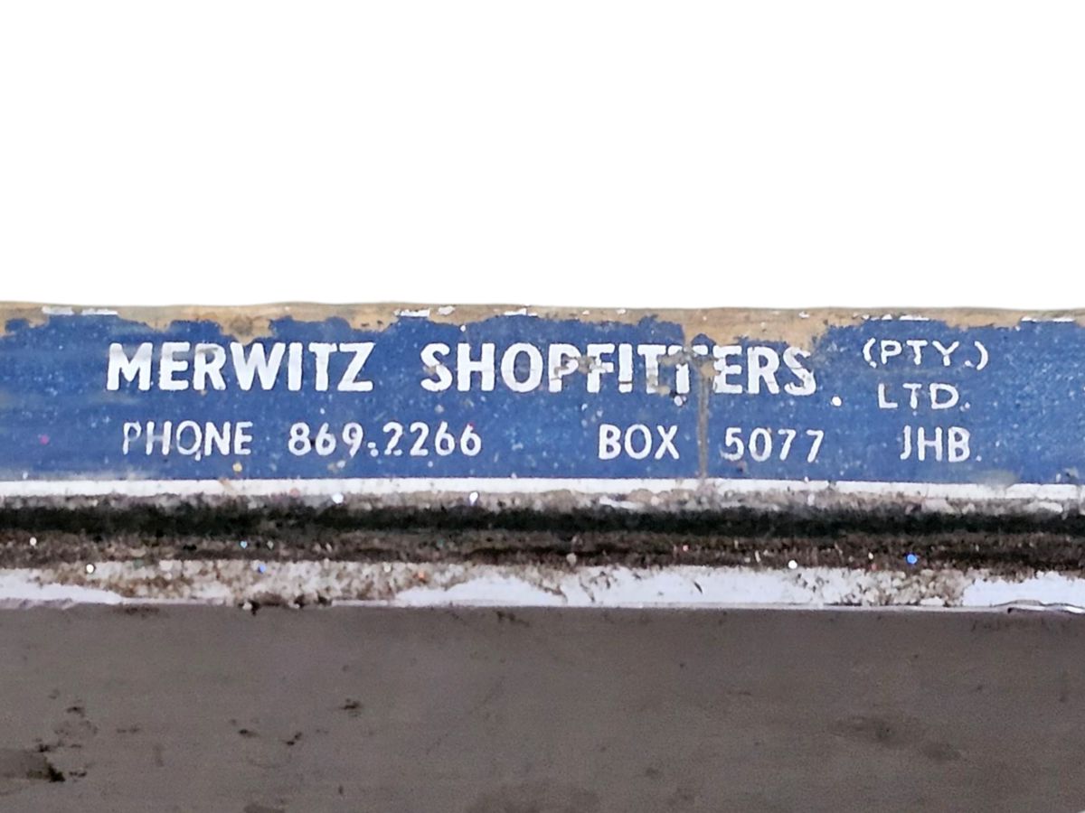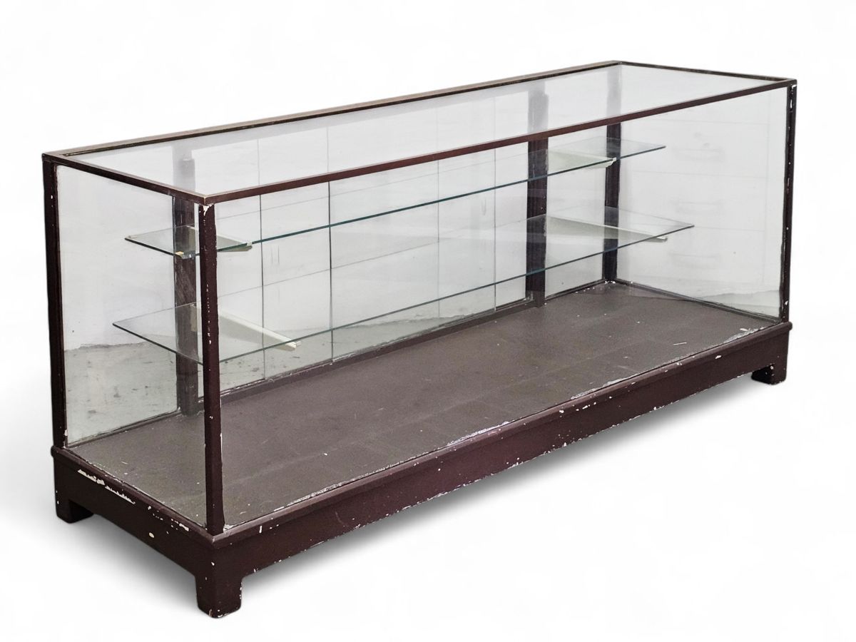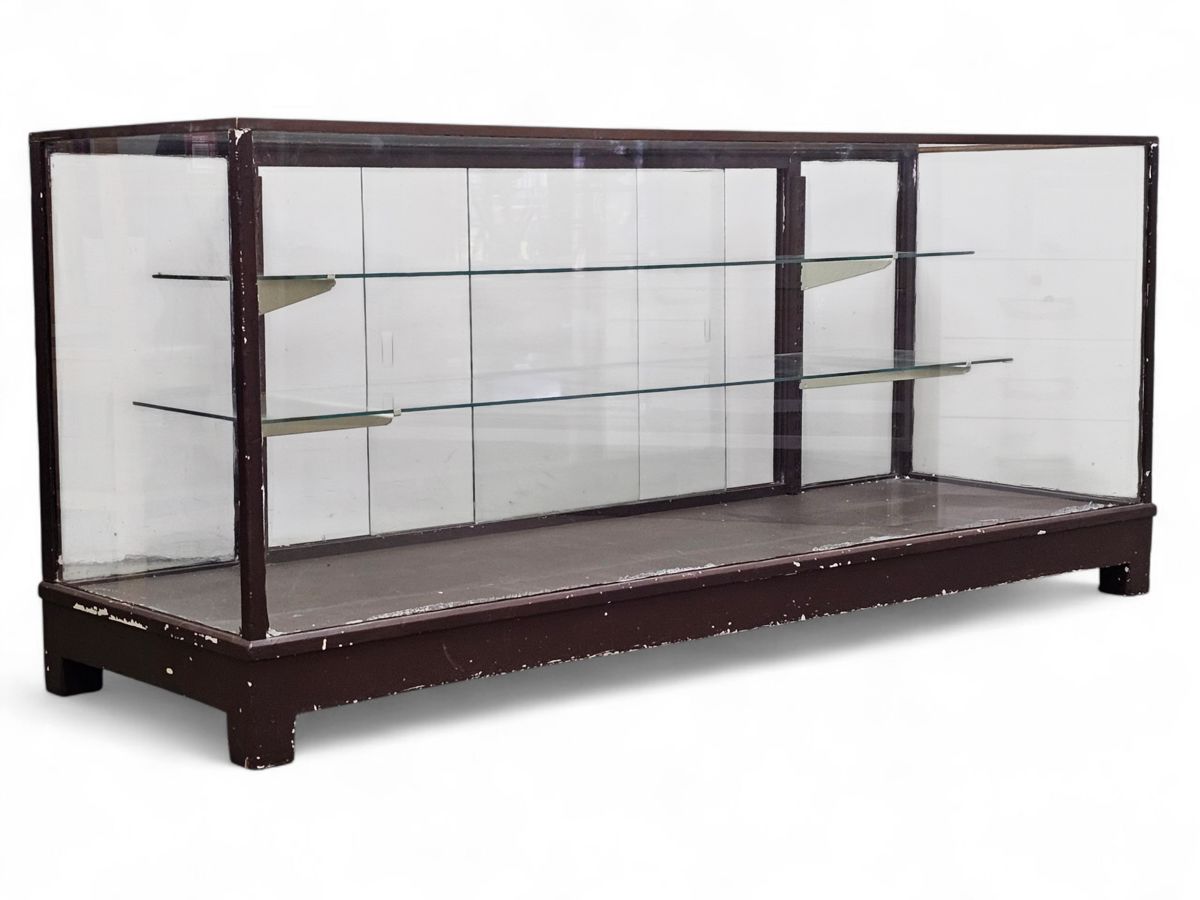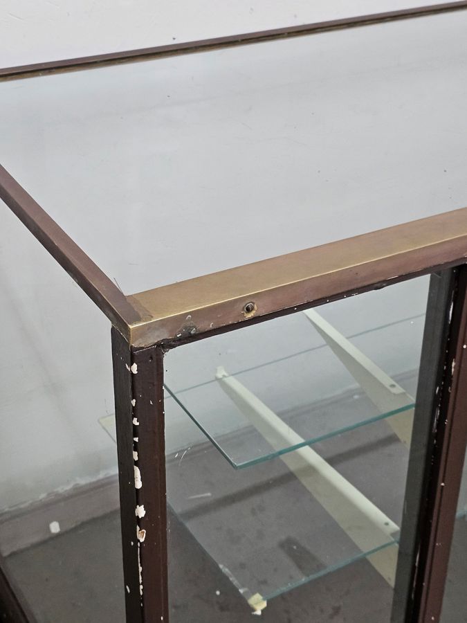 Construction: The top frame surrounding the glass is crafted in brass, which provides an elegant, classic finish. This is complemented by a lower frame and base made of solid wood.Design: A long, low counter with a clean design that allows for maximum visibility. The internal shelving is made of glass.Condition of Glass: All external glass panels (top, front, sides) have no chips or cracks. Please note that the top inner glass shelf has a chip.Condition of Frame & Base: The brass top frame is in original, unpolished condition and needs a clean/polish to restore its luster. The wooden base and lower frame have been painted (a dark brown/black colour) and the paint shows significant wear and signs of use, adding to its authentic, timeworn character.
