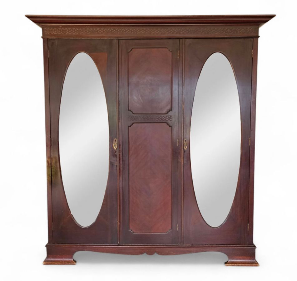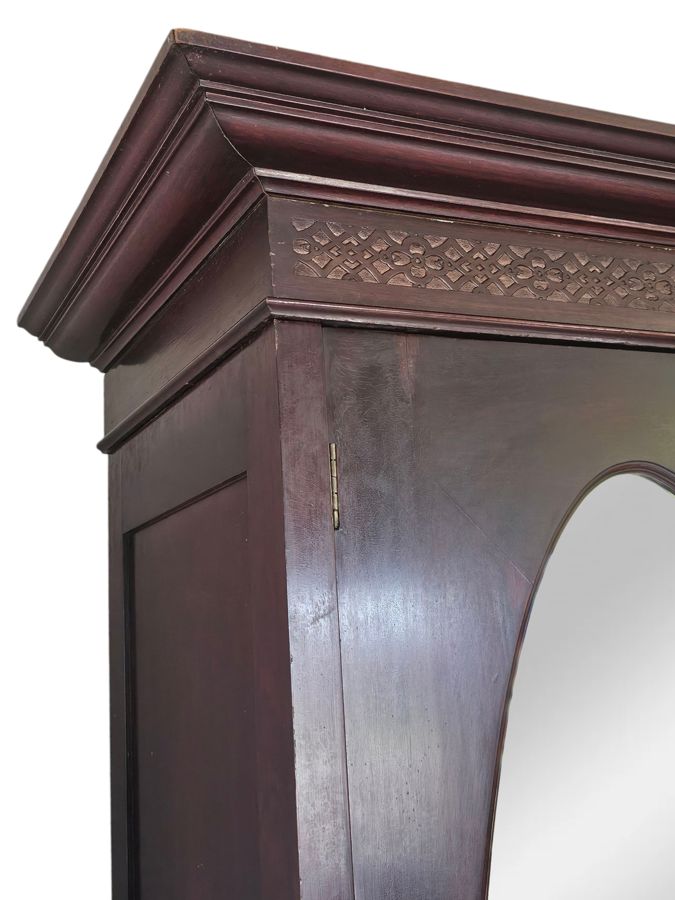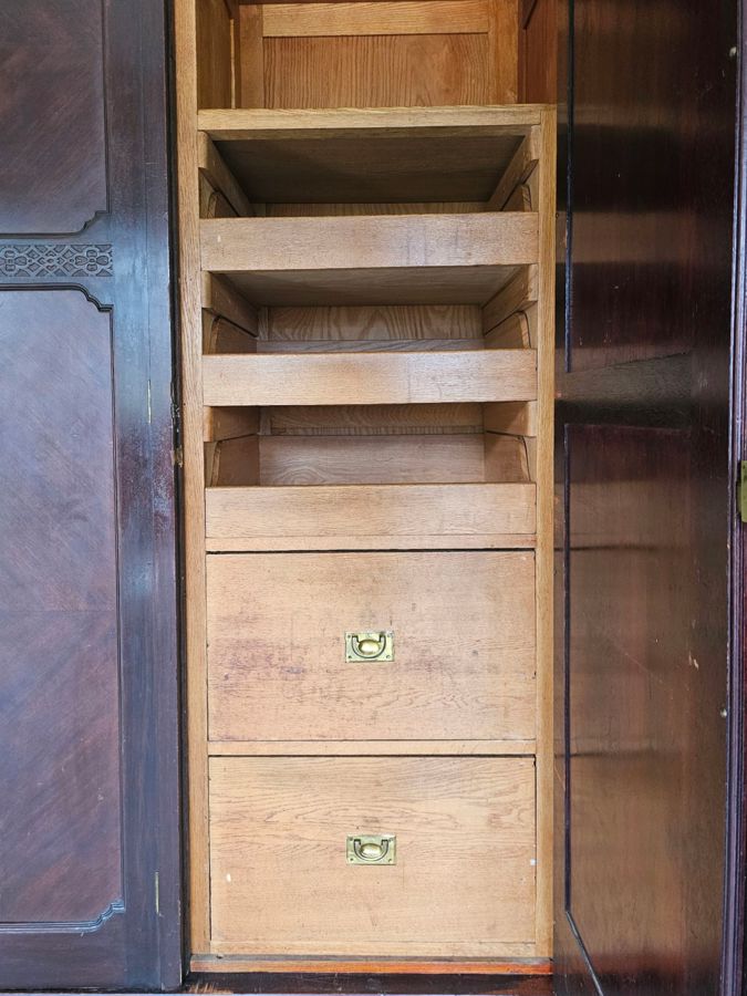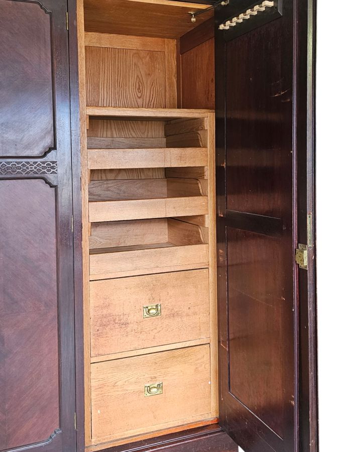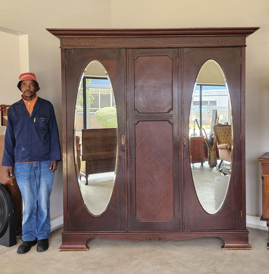 Material: Constructed from beautiful, rich rosewood, displaying the natural variations in grain that make this timber so desirable.Design: A functional three-part design:Outer Doors: The two outer doors feature tall, oval bevelled mirrors.Central Section: The middle section has two panelled doors above a single large drawer along the bottom.Base: A deep plinth base that lifts the entire unit.Hardware: Fitted with original, period-appropriate brass-tone handles and lock plates.Condition: In very good age-appropriate condition with a lovely, age-deepened . Inner part do have sliding tie or belt rack , drawers with brass handles .
