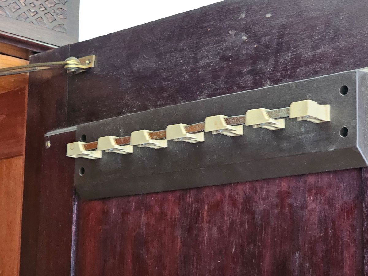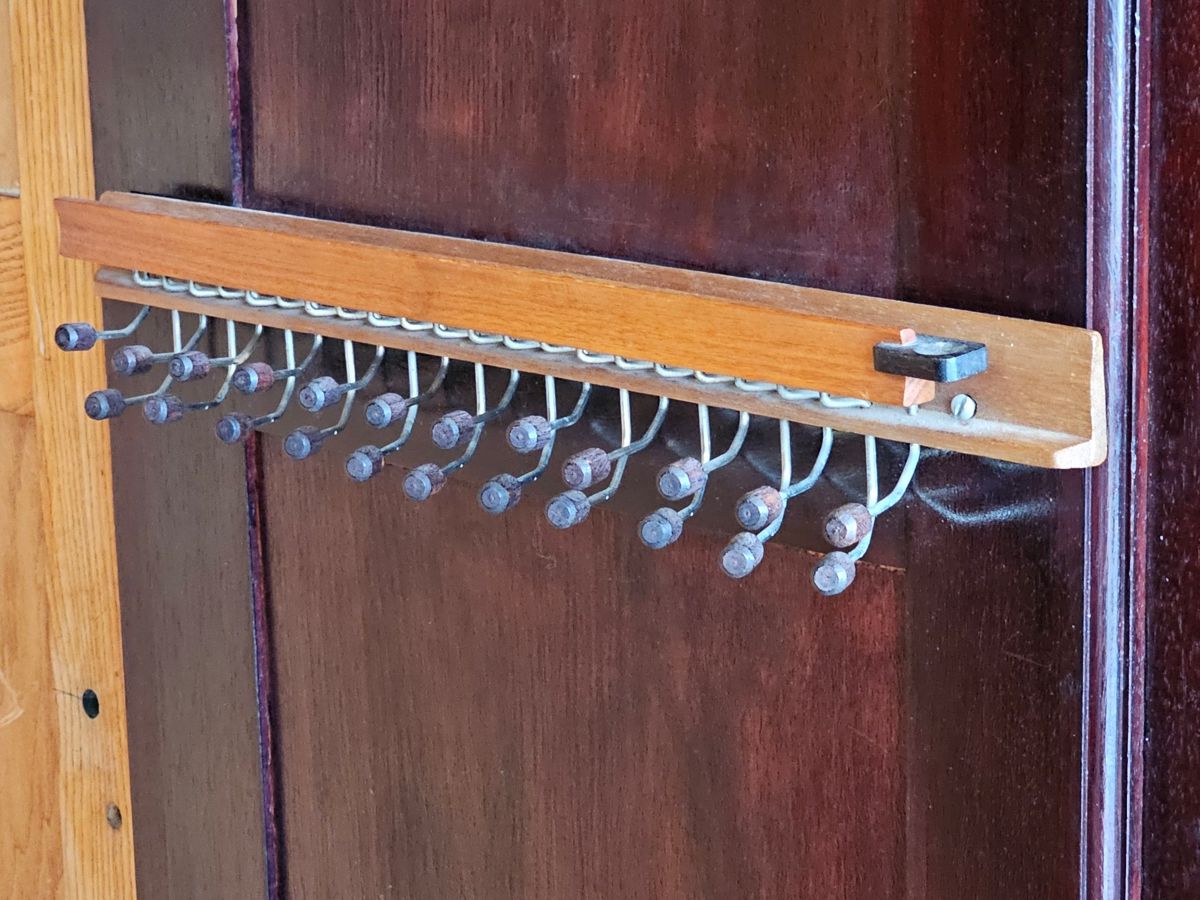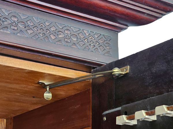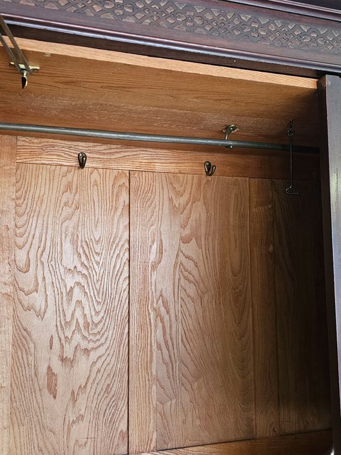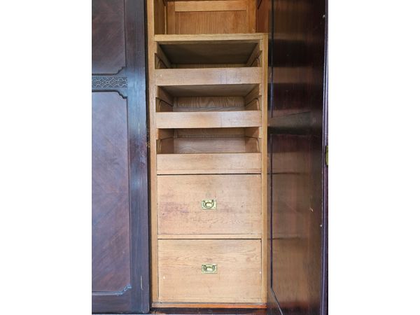 Material: Constructed from beautiful, rich rosewood, displaying the natural variations in grain that make this timber so desirable.Design: A functional three-part design:Outer Doors: The two outer doors feature tall, oval bevelled mirrors.Central Section: The middle section has two panelled doors above a single large drawer along the bottom.Base: A deep plinth base that lifts the entire unit.Hardware: Fitted with original, period-appropriate brass-tone handles and lock plates.Condition: In very good age-appropriate condition with a lovely, age-deepened . Inner part do have sliding tie or belt rack , drawers with brass handles .