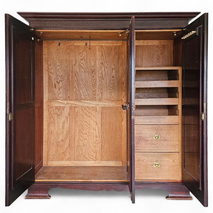 A truly exceptional and substantial antique three-door wardrobe or compactum, dating from the late Victorian or early Edwardian period (circa 1890-1910). This magnificent piece is crafted in highly figured rosewood or a rich rosewood veneer. Rosewood is a prized, dense hardwood known for its unmatched durability, rich, vibrant colours, and natural capacity to withstand decay.