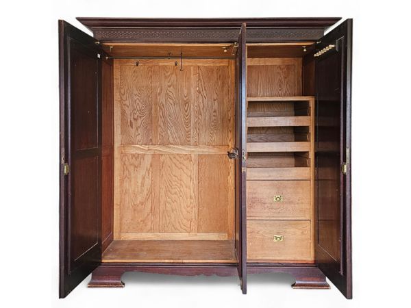 The wardrobe features a traditional "breakfront" style and classic design elements of the period, including a detailed carved pediment top and a substantial plinth base with Victorian-style bracket feet. The piece can be separated into multiple manageable sections for transport (a "knockdown" design).