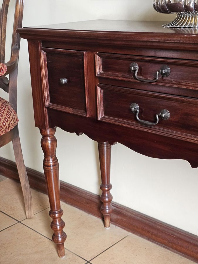 Material: Constructed from solid hardwood throughout, providing durability and a classic look.Design: The table features two smaller central drawers for accessories, flanked by two faux-drawer panels on the sides. It has a distinctive, gently scalloped apron beneath the drawers.Legs: Supported by four beautifully crafted, heavily turned legs that taper toward the base, providing an elegant and sturdy foundation.Hardware: Fitted with original, dark metal drop ring pull handles with ornate backplates on the two working drawers.Style: A traditional Victorian or Georgian reproduction style that fits well within classic interior aesthetics.