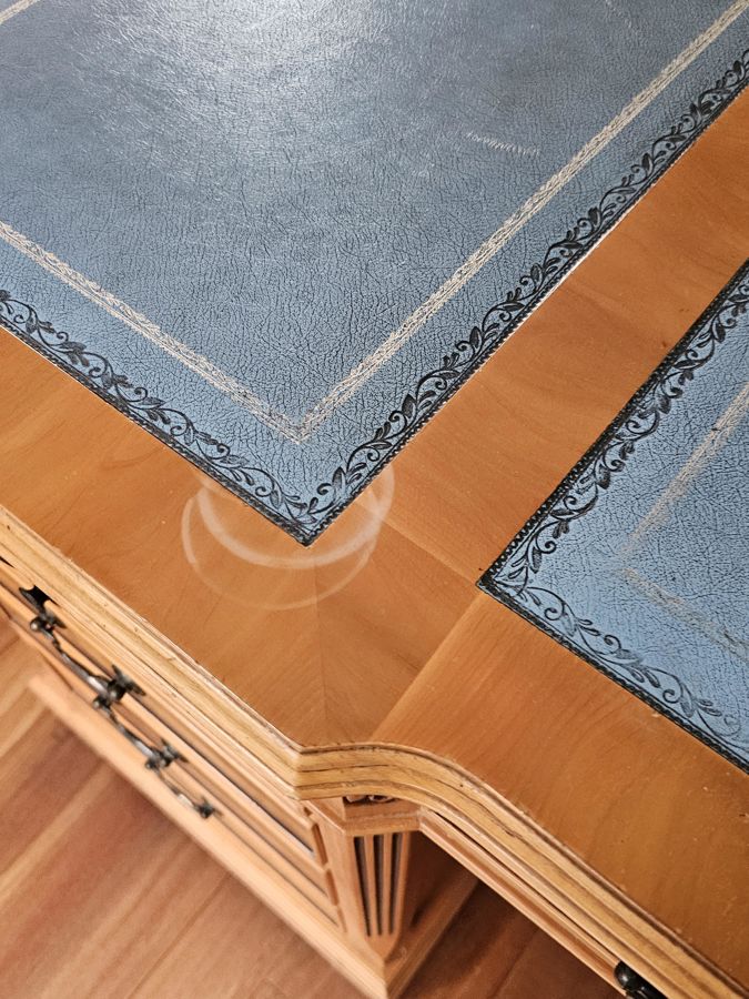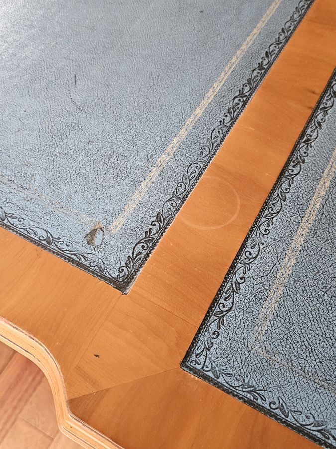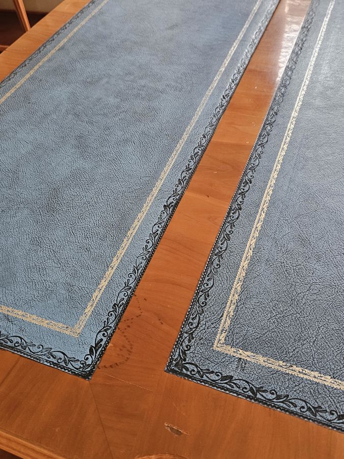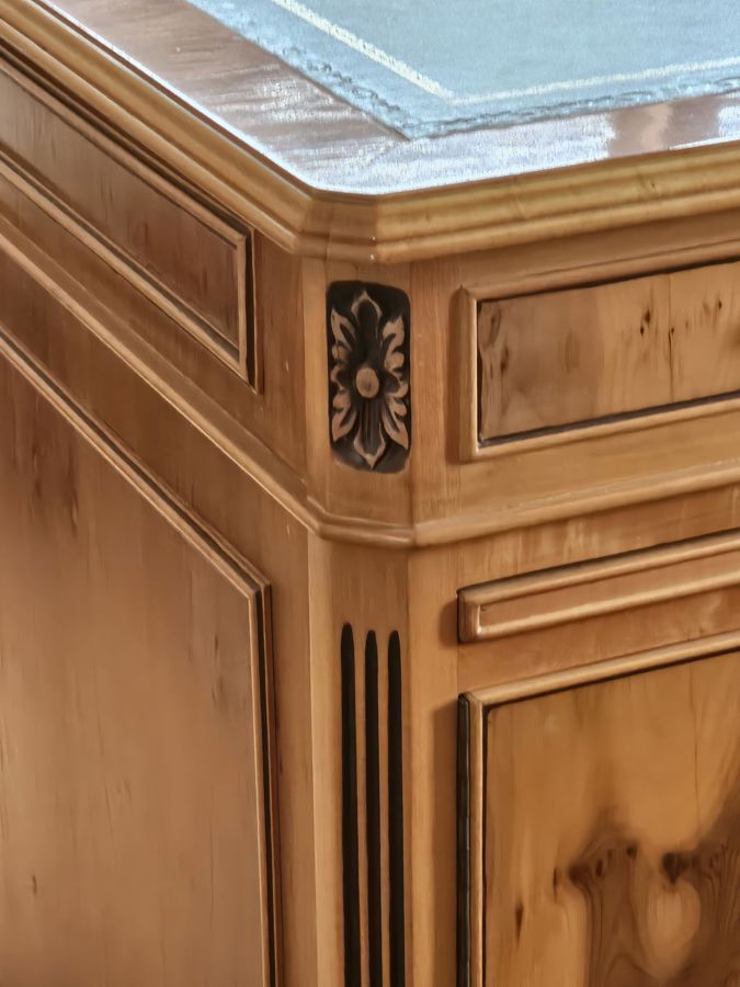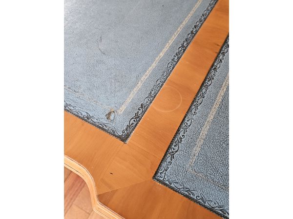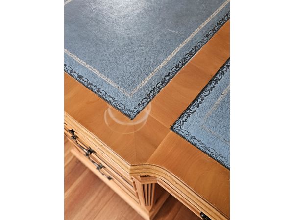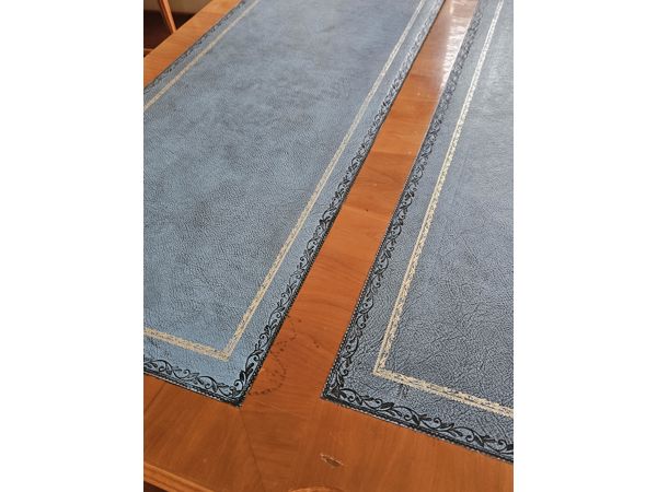 - Top: The expansive desktop features a stunning, tripartite (three-panel) blue genuine leather inlay with elegant gold and black embossed detailing around the edges.