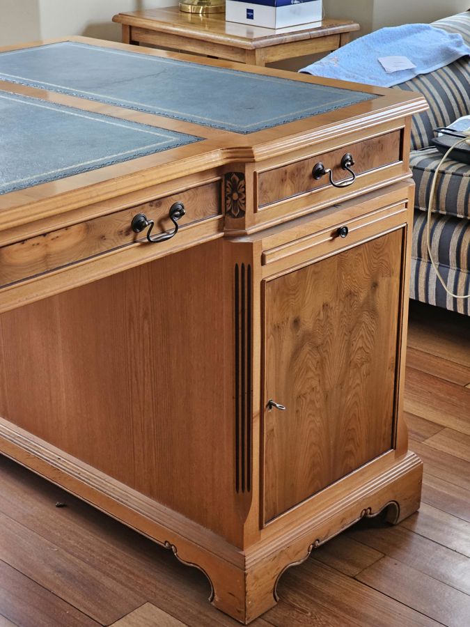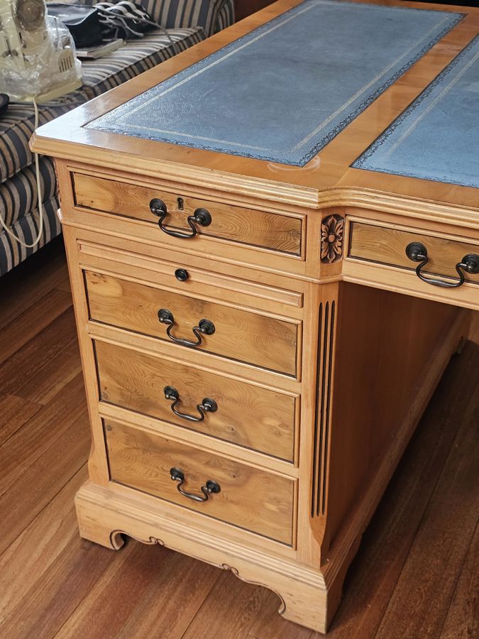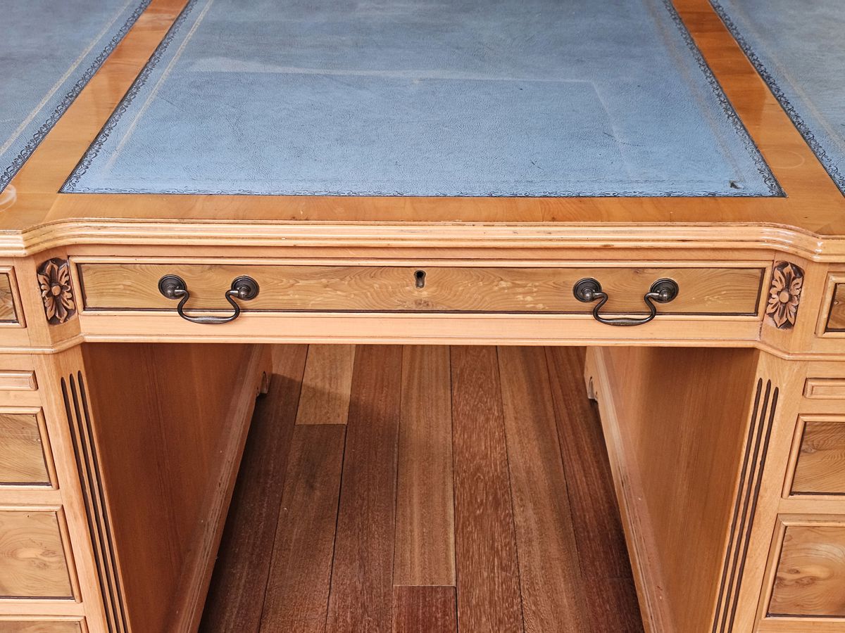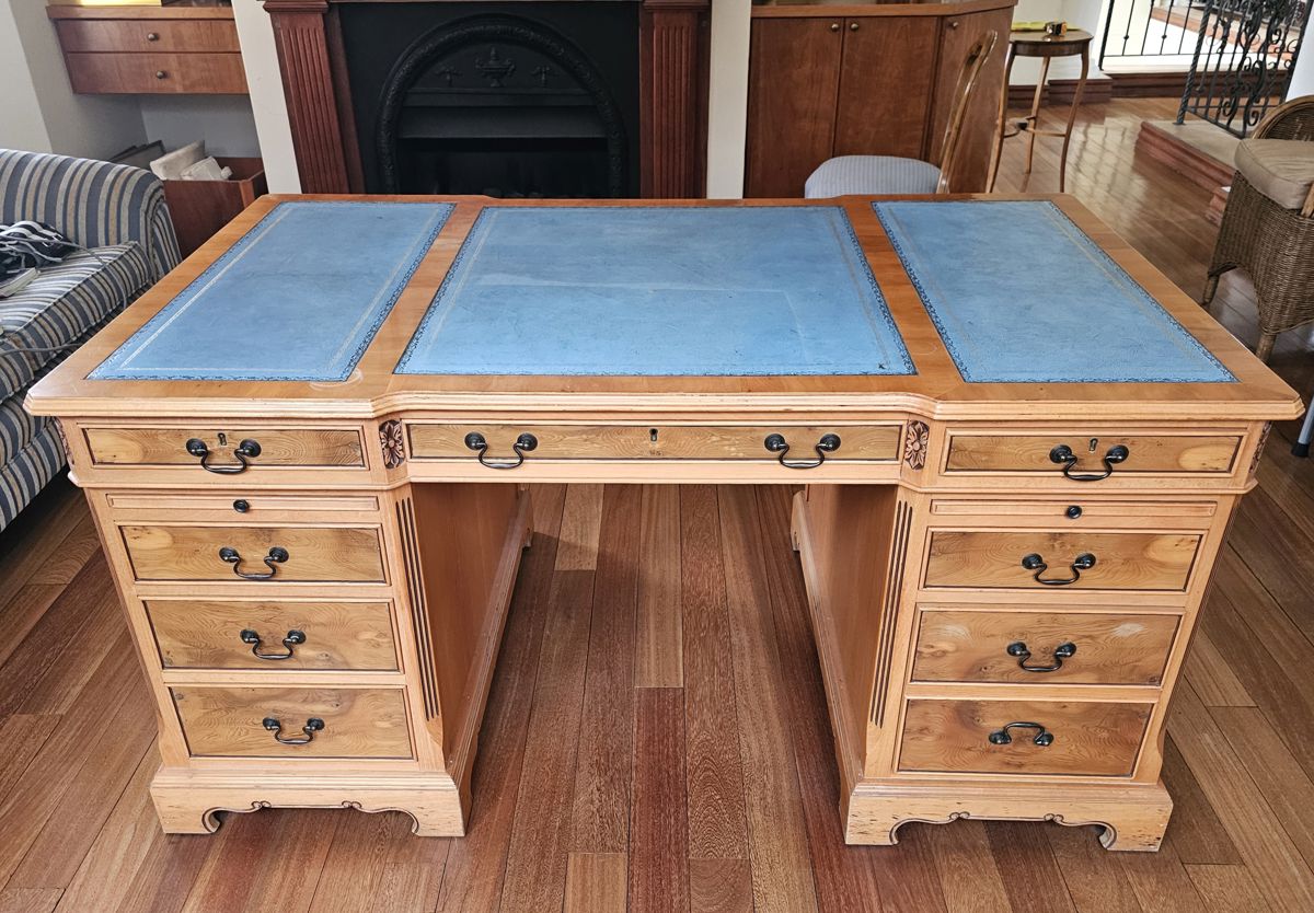 Gordon Fraser' Yewwood Partners Desk with Blue Leather Inlay 153cm(w) x 92cm(d) x 76cm(h)