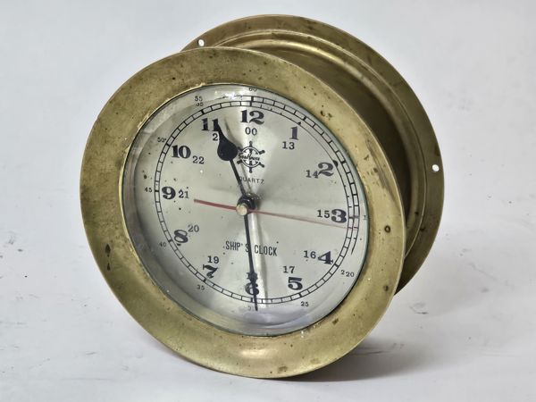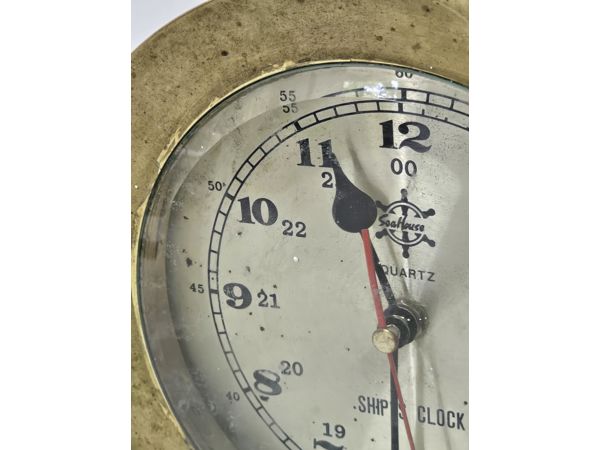 The timepiece features a classic nautical design with a heavy brass case and a clear dial marked with "QUARTZ" and "SHIP'S CLOCK." It is a charming decorative piece with a distinct maritime style, suitable for a collector or for adding a touch of nautical history to any room.
