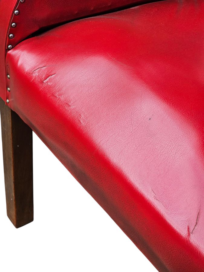 It is upholstered in a vibrant red vinyl.