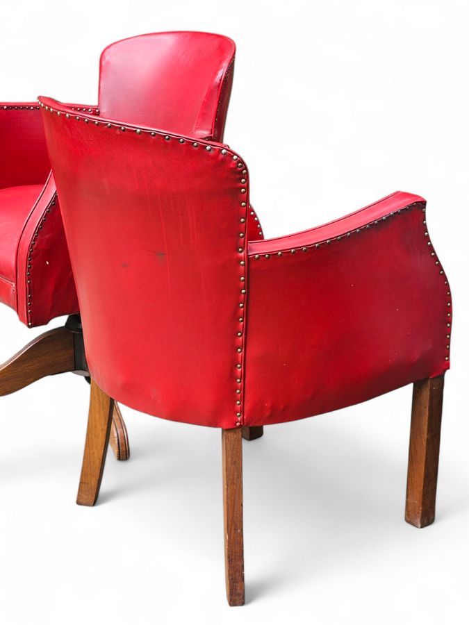 The chair features a rounded back and wide, curving arms with nailhead trim, upholstered in red vinyl. It is supported by a five-star pedestal base with a swivel mechanism, crafted from solid wood, giving it a robust and professional look. This piece combines a classic style with durable materials suited for a busy office or study space. Good vintage condition. The upholstery shows signs of wear and patina consistent with age, with some areas of creasing, that adds to its Old school style and will blend in with modern and vintage style decor.