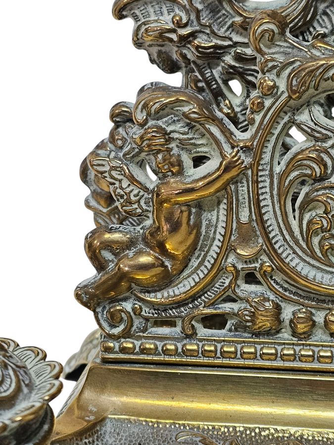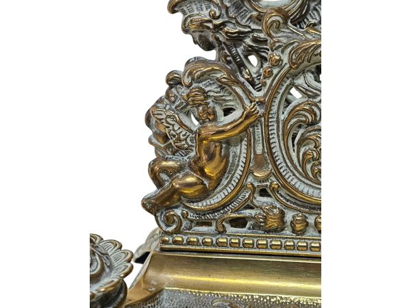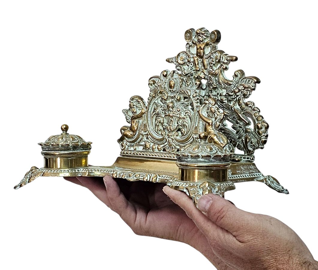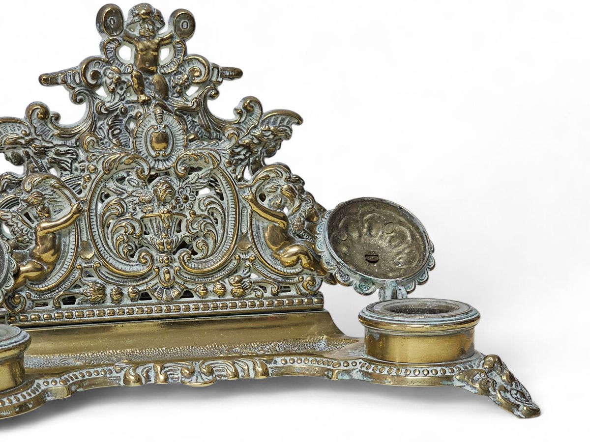 The central feature is a striking, pierced letter holder or rack, topped by a detailed figure of a putto (cherub) amidst scrollwork. The base is flanked on either side by finely cast reclining lion figures and flows forward into an integrated pen rest tray. The stand is equipped with two lidded, hinged inkwells at either end, complete with their internal metal or glass liners. The lids are embellished with matching ornate finials. The brass exhibits a rich, aged patina, highlighting the detailed craftsmanship.