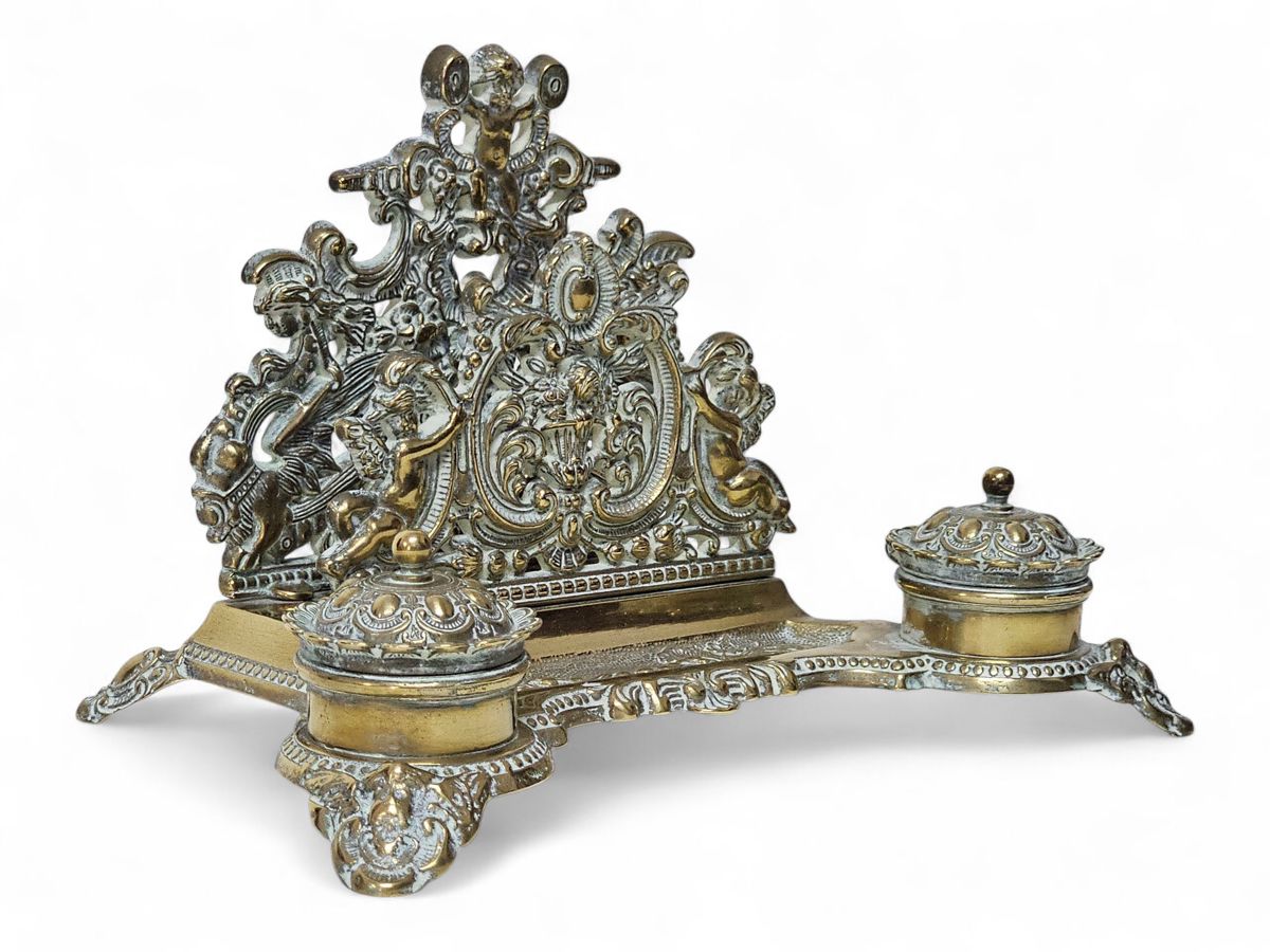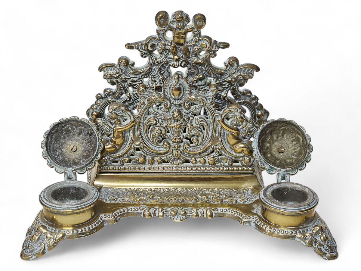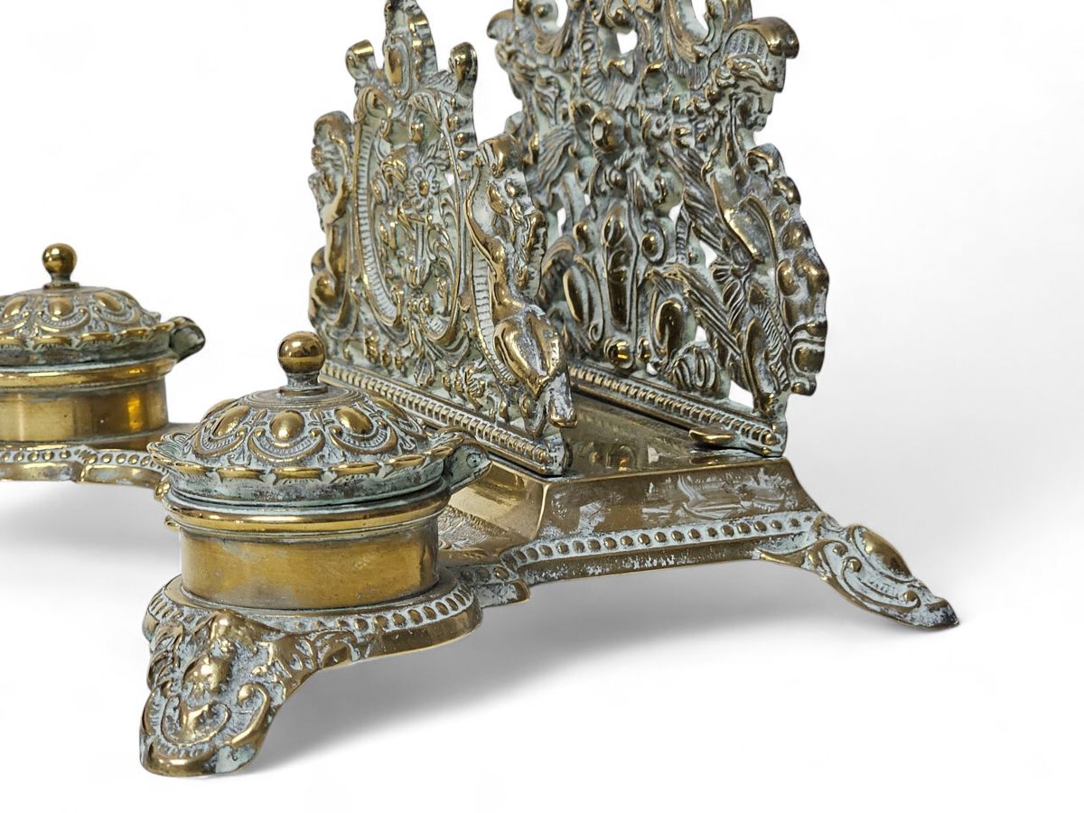 Victorian/ Rococo Style Gilt-Brass Double Inkstand and Letter Rack 30cm(w) x 20cm(d) x 19cm(h)