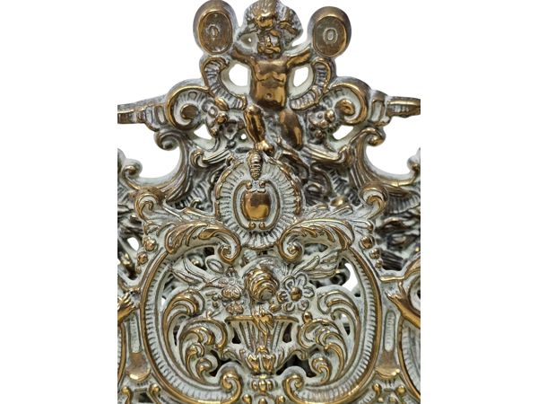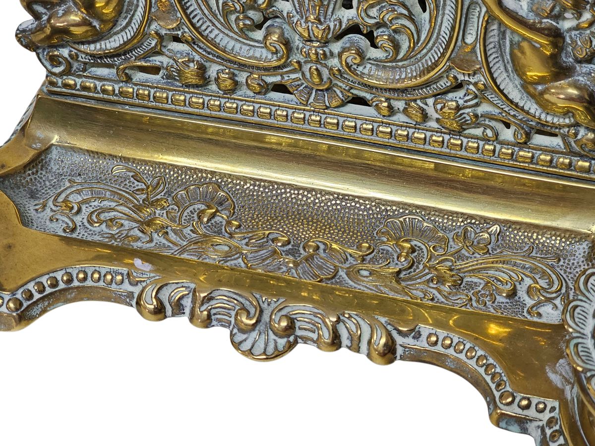 A highly ornate, substantial cast-brass desk stand, circa late 19th or early 20th century, executed in an elaborate Baroque or Rococo revival style. The piece features intricate repoussé (hammered relief) decoration throughout, showcasing extensive scrolling foliage, acanthus leaves, and mythical motifs.
