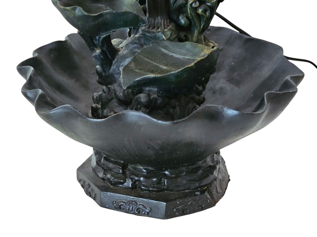 The fountain element is integrated into the base, depicting a naturalistic scene with leaves and a single bloom from which water gently spouts into the scalloped basin below, creating a tranquil atmosphere with the sound of flowing water. Style: Art Nouveau inspired, elegant figural design.Functionality: Dual-purpose as both a table lamp and a working water fountain with a recirculating pump.Materials: Cast composite material with a hand-applied patinated bronze finish; ribbed glass shades.Condition: In good working order for both light and fountain features. Minor signs of use consistent with age; please inspect photos carefully for exact condition details.Aesthetic Appeal: The combination of soft lighting and the soothing sound of water makes this a unique statement piece for a living room, conservatory, or office.