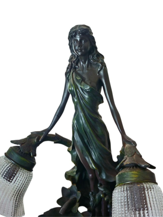 A striking and functional piece of decorative art, this large table lamp also functions as a self-contained, recirculating water fountain. The sculpture is rendered in the elegant Art Nouveau style, featuring a gracefully draped female figure with a detailed verdigris/bronze finish. The figure holds two branches that terminate in ribbed, bell-shaped glass shades, providing a warm ambient light.