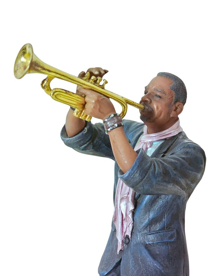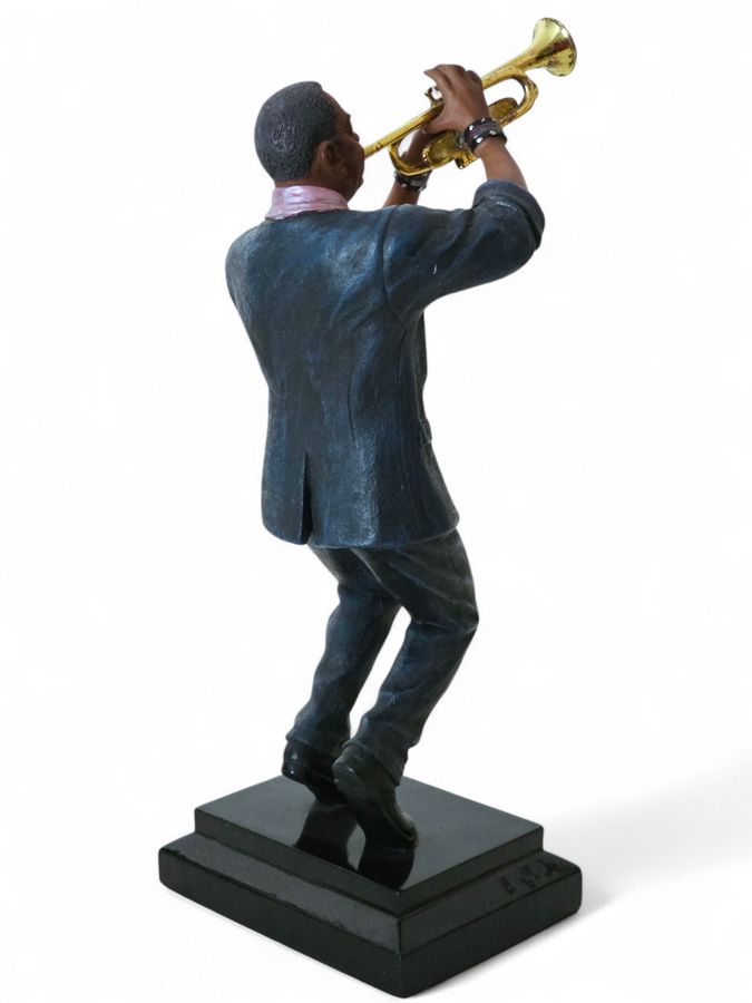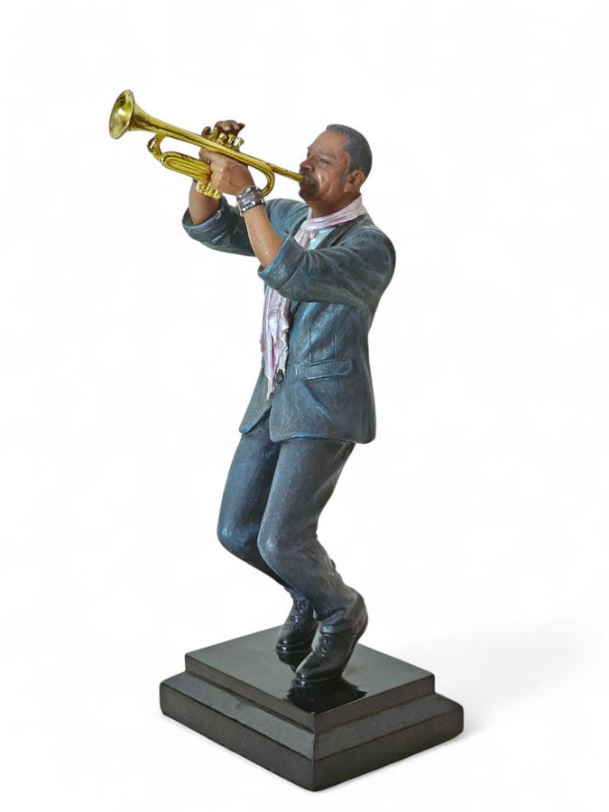 A finely detailed and hand-painted figurine depicting a jazz musician energetically playing the trumpet. The sculpture captures a dynamic pose with expressive details in the musician's attire, scarf, and instrument