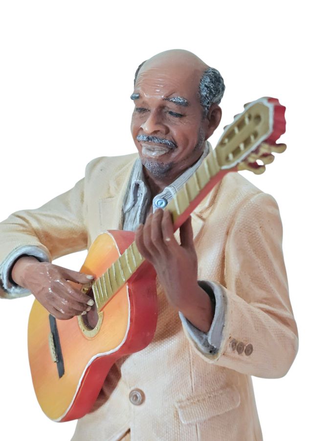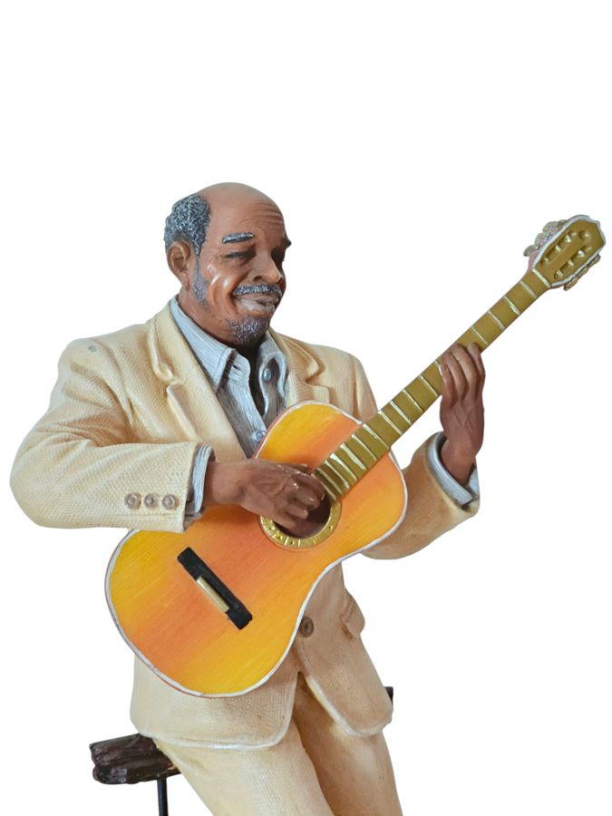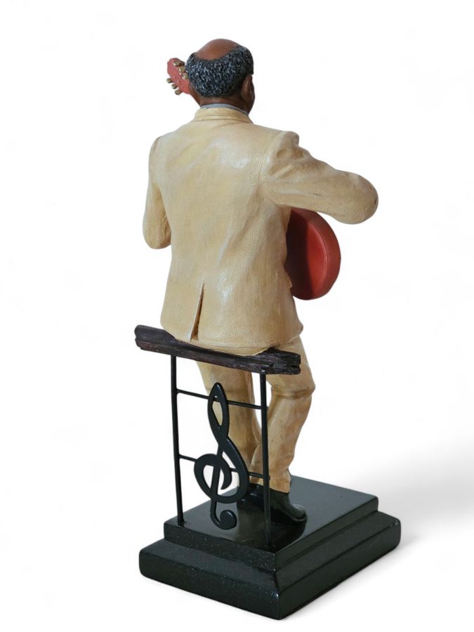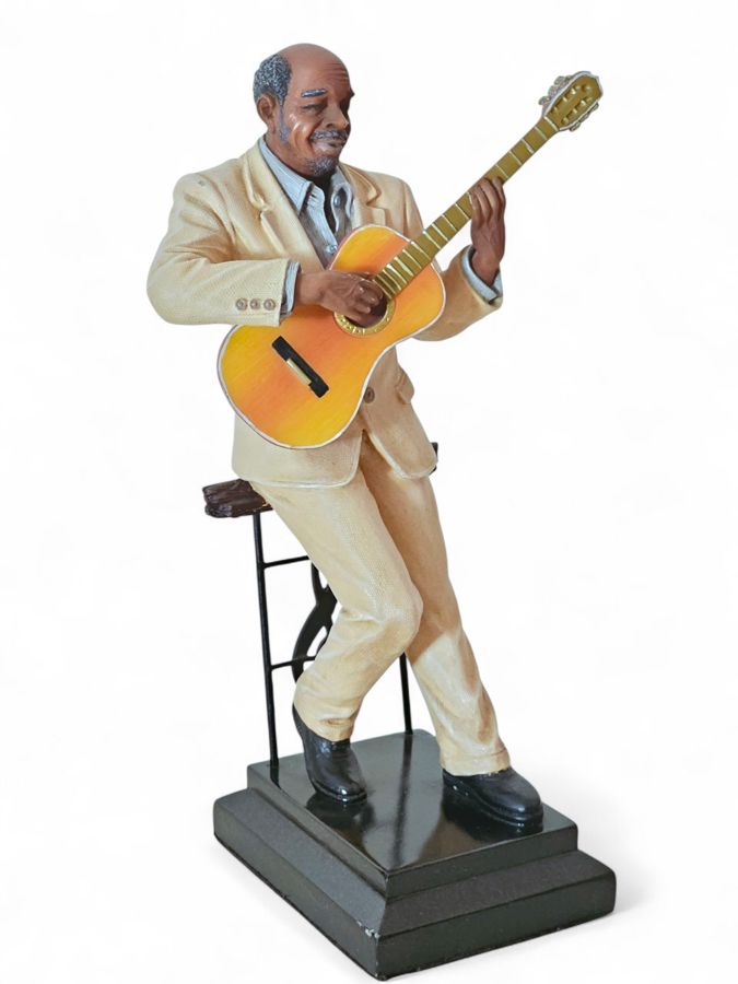 A finely detailed and hand-painted figurine depicting a jazz musician energetically playing the classic guitar. The sculpture captures a dynamic pose with expressive details in the musician's attire, scarf, and instrument
