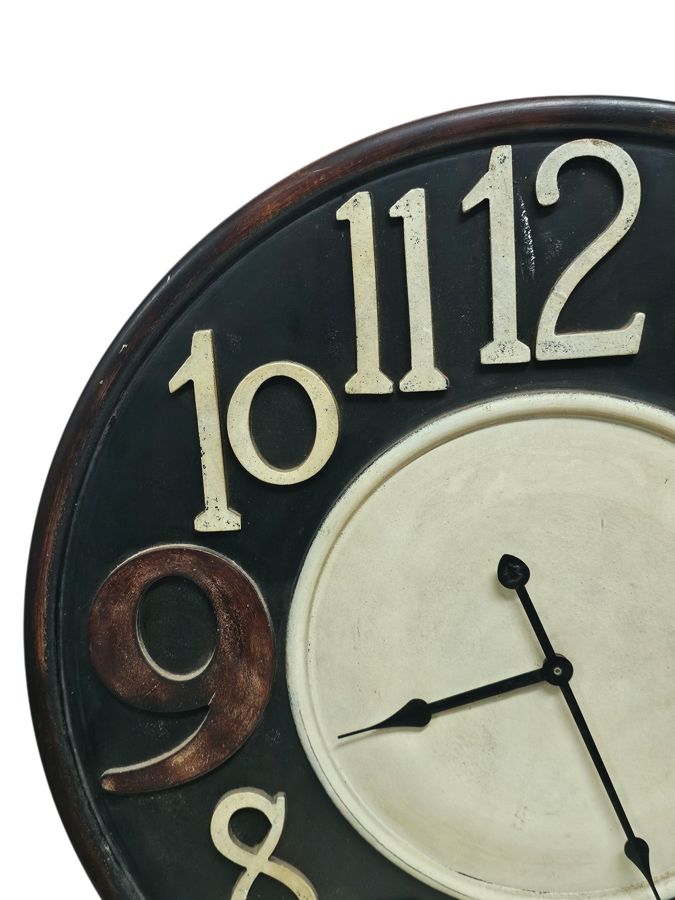 A large, round wooden wall clock designed in a rustic or farmhouse style. The dark wooden frame encircles a distressed cream or off-white central face. The dial features a mix of raised, bold Arabic numerals in white on the black outer ring and dark, contrasting numerals in the lower section. It is fitted with black metal hour and minute hands.Mechanism: Features a modern quartz, battery-operated movement (requires one AA battery, not included). The mechanism is designed for silent, non-ticking operation.