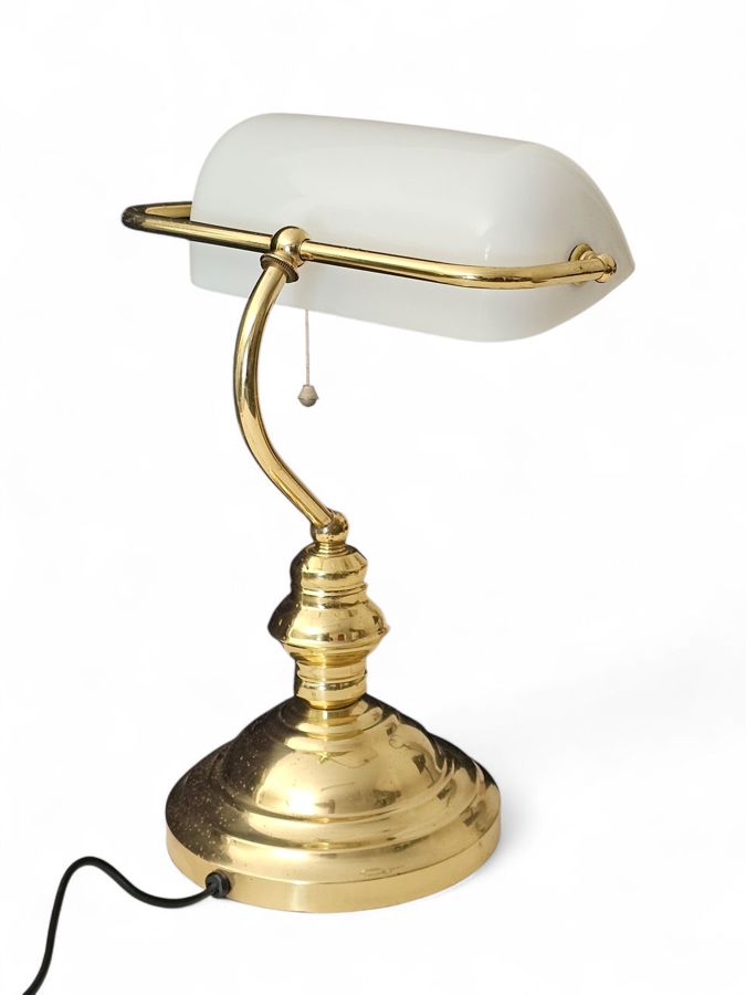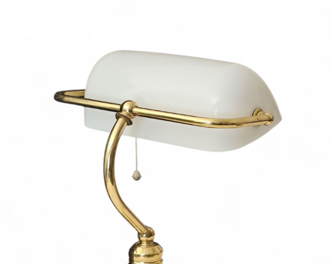 A modern decorative table lamp in the classic banker's style. Features a polished brass-tone metal base and an adjustable, curved white PP plastic shade. The lamp operates via a pull-chain switch mechanism.