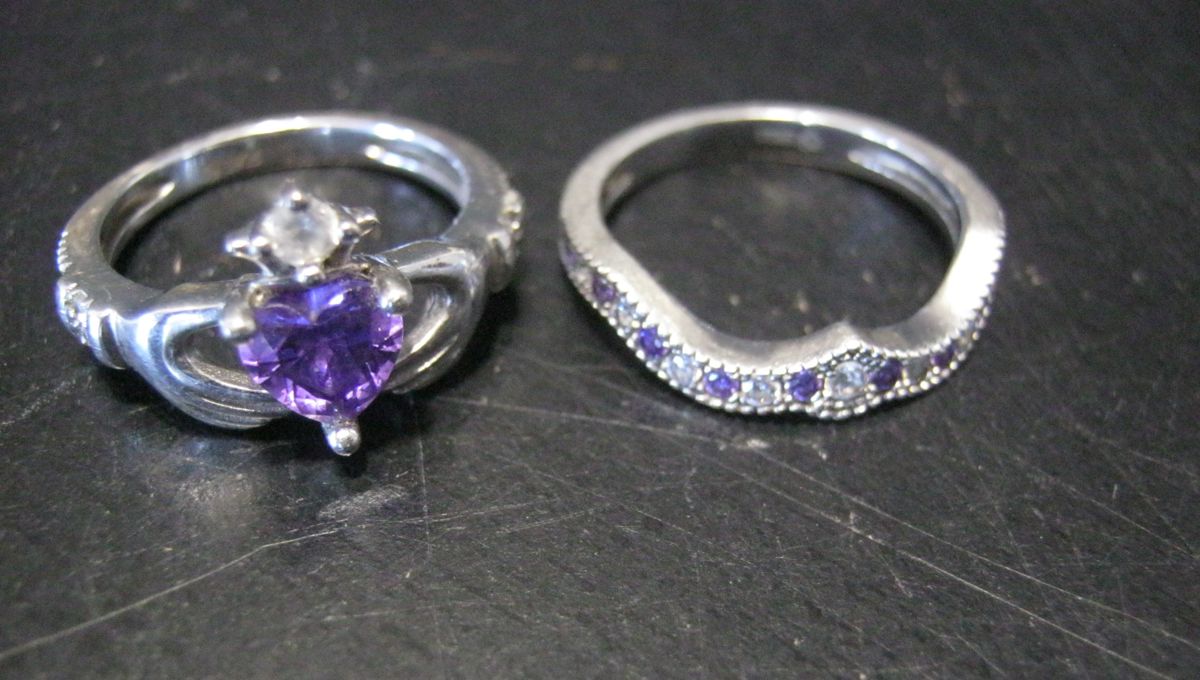 STERLING SILVER CLADDAGH RING WITH WHITE AND PURPLE STONES
